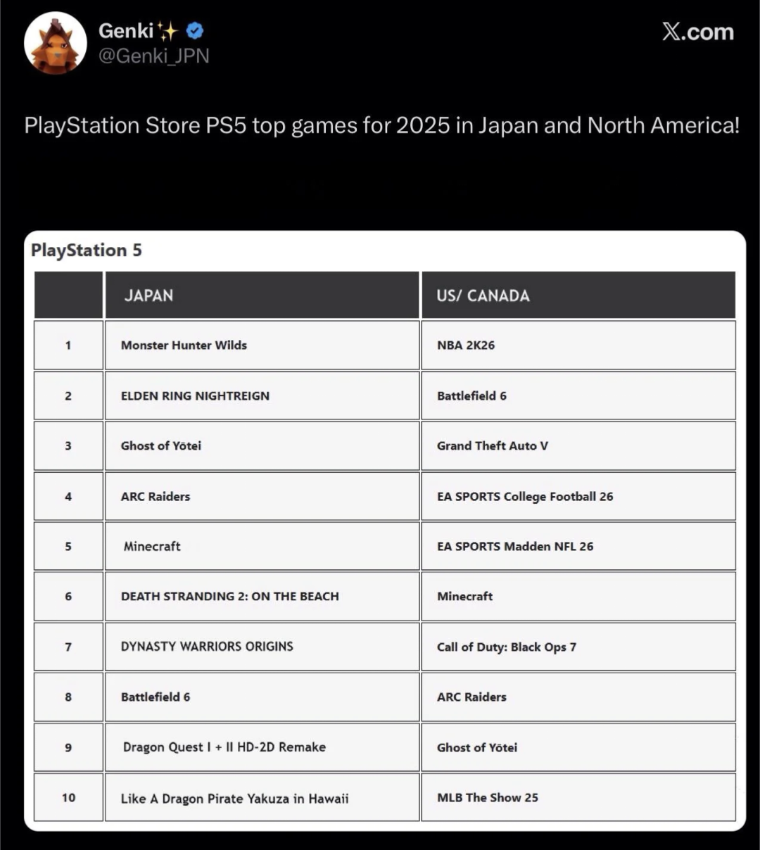 >>555703253>>555701998>>555701652Speaking of statistics of the tastes of Americans, here's the top PS5 games of American vs Japanese players