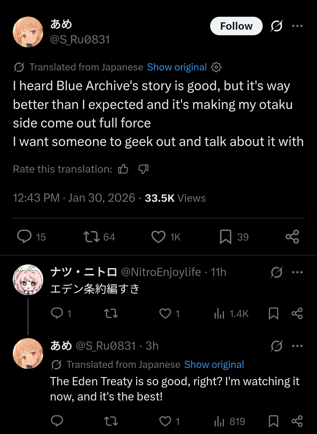 >>555759515>Like BA artwork>Twitter sees that you're posting in english>"You might also like this English post ffrom the same community">Select "Do not show">It stops showing you BA artwork entirely>Start liking BA artwork again so it shows up in your feed again>Twitter can see your system language and location at all times>"We see you're posting in english, perhaps you would enjoy this english post from the same fandom">"Hide content">You hid this BA content so you must not want to see any more BA content>Have to like images for BA content to show up again>Repeat