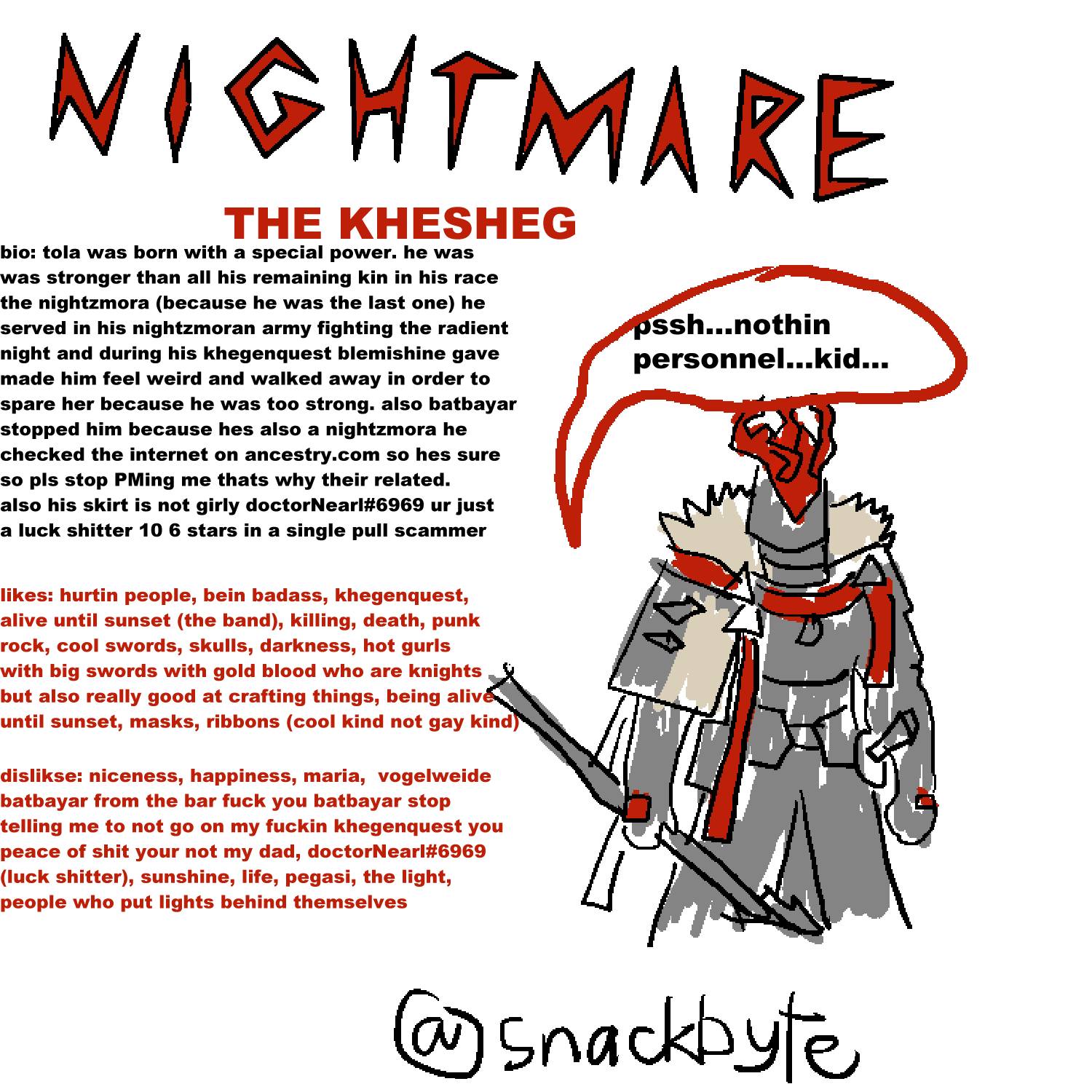 On the topic of Liberi eggs...>about to sleep>hear knock at your door>its Silence>she's a bit red in the face and her breathing is labored>she's having problems and came to you since she knows you'll keep a secret>she opens her coat to show a small bulge in her otherwise flat belly>she can't get her egg out>asking Ifrit would be weird>Joyce said to ask you>you've never done this before but she came to you>after about an hour of trying to tease it out she clearly isn't doing well>she begs you to punch it out if you have to>siderocatrainedyouforthis.exe>it's out>it's actually surprisingly big>she passed out but she should be fine>tuck her in>go to sleep>Silence is gone by the time you wake up>three weeks later you're pretty sure it was just a zero sanity hallucination>knock at your door>Silence drew an x for you to aim at