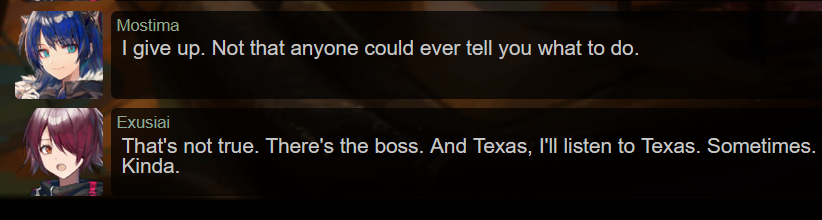 >>555844682Now I'm curious, who knows about the fatso in Ifrit's head? Those who know will know that she's part Sarkaz, but not necessarily know that there's a revenant tagging along too. Amiya and CE would definitely know and I assume Tin Man could figure it out.I'm also doubtful Ifrit would share her experiences with anyone, especially Silence and Saria because she wouldn't want to make them worry.
