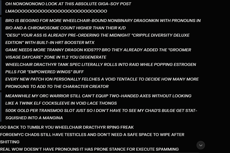 >Transmog now costs minimum 2K gold every single outfit>Even making an item Hidden costs gold now>New alts are restricted to Exile's Reach and all racial Starter Zones are permanently locked>All expansions before War Within are permanently disabled from access starting March 2nd>Mission text and NPC speech bubbles are visibly AI-generated or written by an ESL>Numerous race-specific animations deleted and replaced with generics>Dozens of active abilities deleted across all specs and classes>Existing slutmogs will be deleted and replaced with censored "HD models"