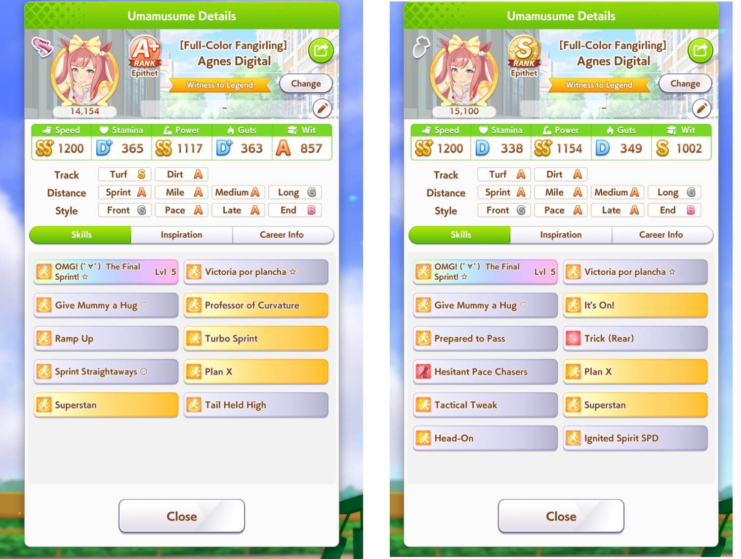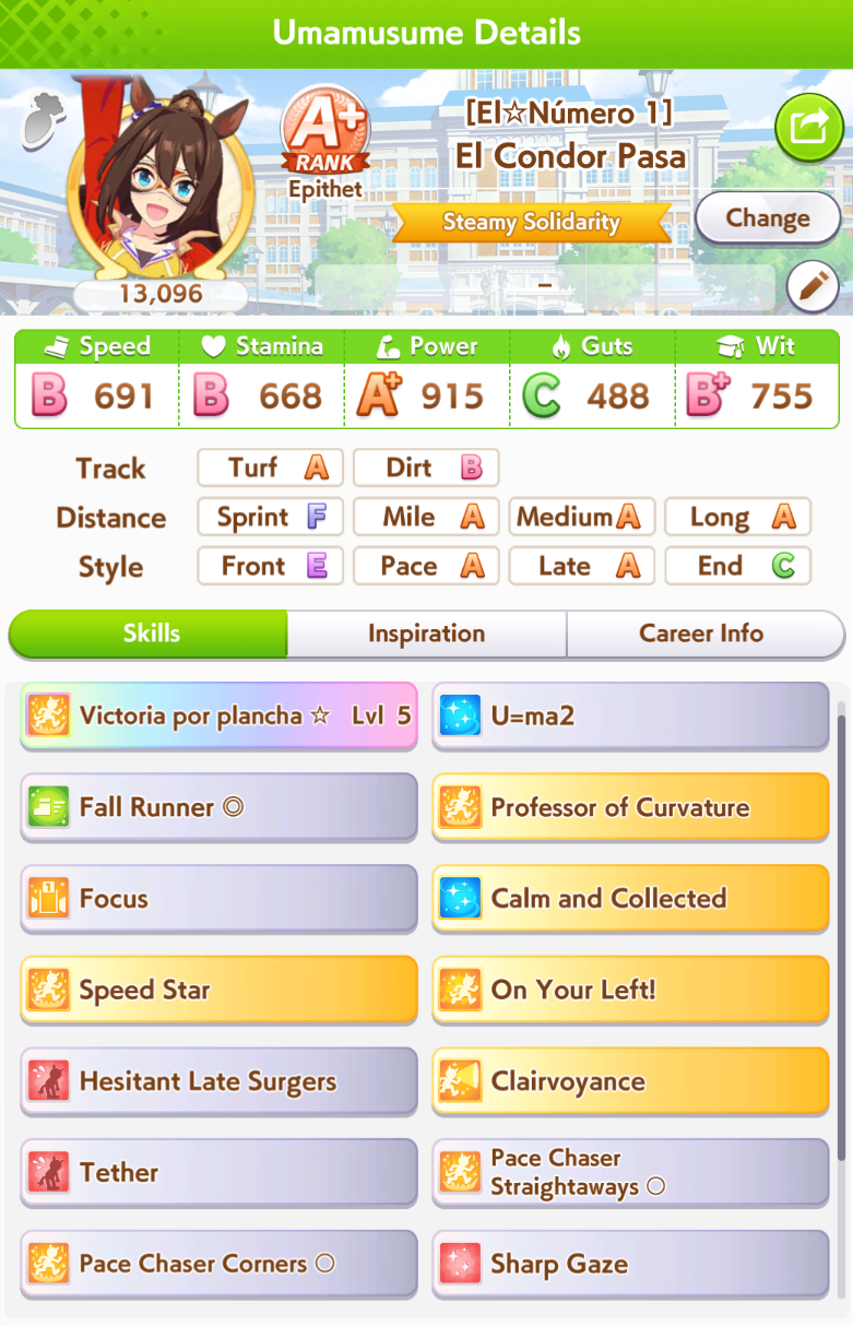 >>555789195I'm almost looking to aim for turf instead since that has more longevity, but I got the sprint parents to bump uma aptitudes to B and A, and when I'm out of borrows, may as well try to aim for stronger affinity and whatnot. I also don't want to think about dirt parents until I get at least two of my aces set up.