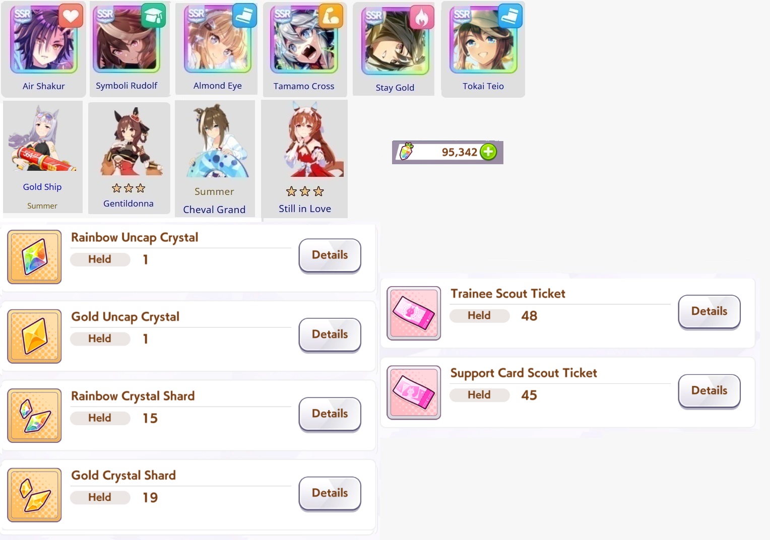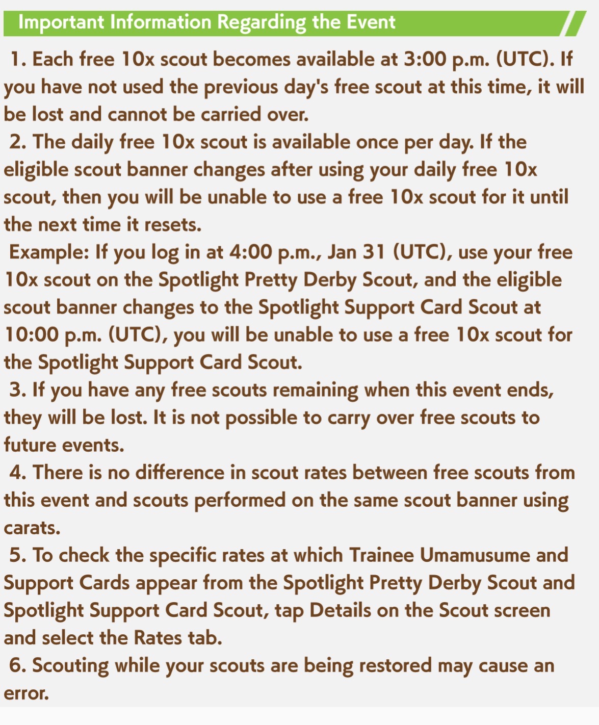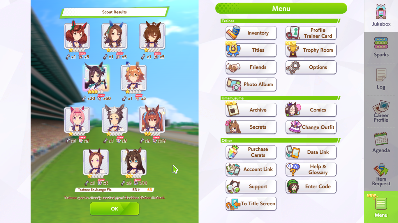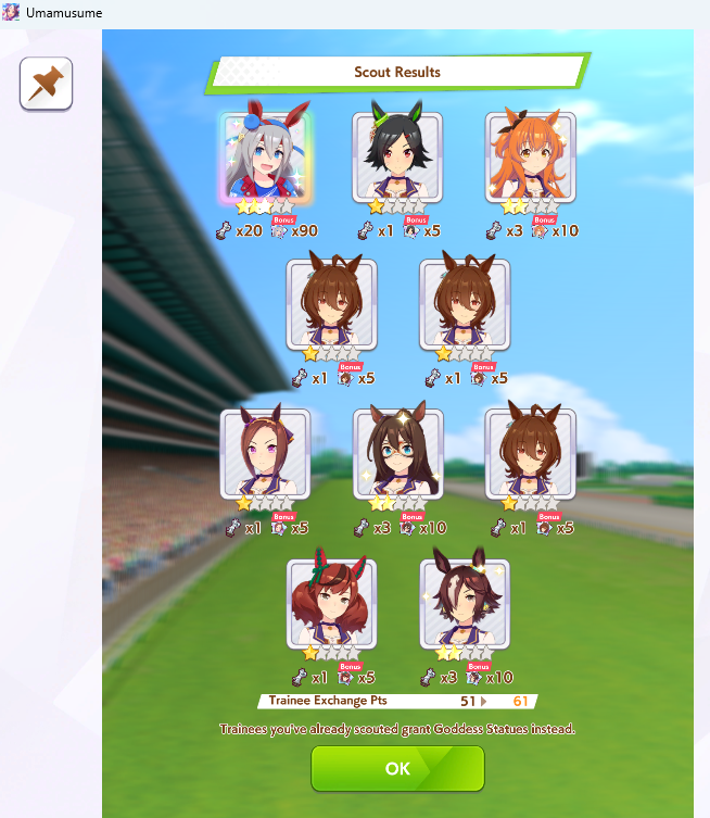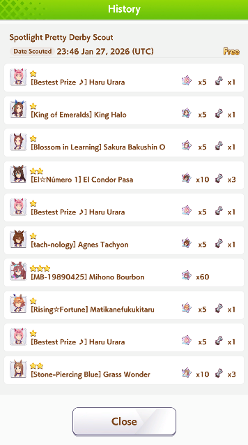 Previous: >>555766579>Global Game NewsLink your account to Cygames iDCurrent Scenario: Aoharu Hai aka "Unity Cup"Current Rate Up Trainee: New Year T.M. Opera O (3*), New Year Haru Urara (3*)Current Rate Up Support Cards: SSR Admire Vega (Power), SSR Matikanefukukitaru (Speed)Current CM: Capricorn Cup - Chukyo Turf 1200mMain Story Chapter 5 is out01/27 - New Beginnings Part 101/29 - NY Opera & Haru 3*+Fuku SSR+Ayabe SSRMid February - Capricorn Cup - Chukyo Turf 1200mhttps://umamusume.com/news/100040/https://pages.snep.pw/uma/anni-skill-changes/>JP Game NewsCurrent Rate Up: Valentine Taiki Shuttle (3*), Valentine Sounds of Earth (3*), SSR Matikanefukukitaru, SSR Neo UniverseNew Scenario "Yukoma Hot Spring" releasedTimeline: https://uma.moe/timelineCygames Webstore: https://webstore.cygames.com/en/umamusume_en/>Thread Clubshttps://rentry.co/umaglobalclublistYou must be E3 (20k points) to join a circle. Apply with /uma/ or /vg/ in your profile or post ID in the thread.>All Guides & Resourceshttps://rentry.org/uma26Game databasehttps://gametora.com/umamusume (Click the gear to switch between JP / global server info)A basic guide for newfagshttps://rentry.org/umaglobalFind networks if your region is blocked from the game or clienthttps://www.umavpn.top/93Seiyuu & Concertshttps://rentry.org/umstUma Texthttps://umareader.idsmile.xyz/