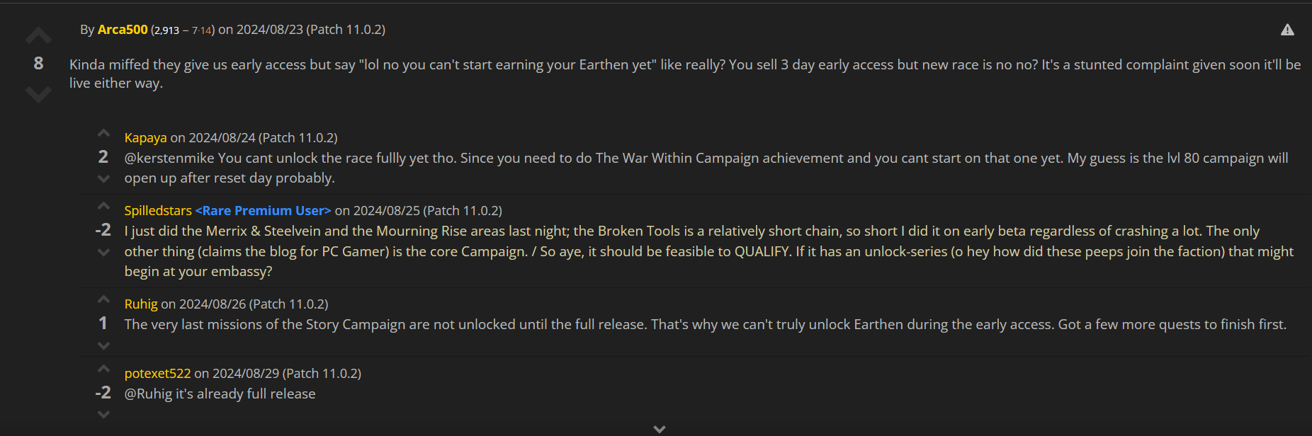 >>555866506m0 or bountiful delves aren't even available during the first two weeks3 days early access is completely useless when all the actual pve content only unlock 2-3 weeks after release used to just have to wait 1 week for the season to start after TWW/DF launch but now you gotta wait 2 weeks for raid launchand THREE WEEKS wait for m+ to start