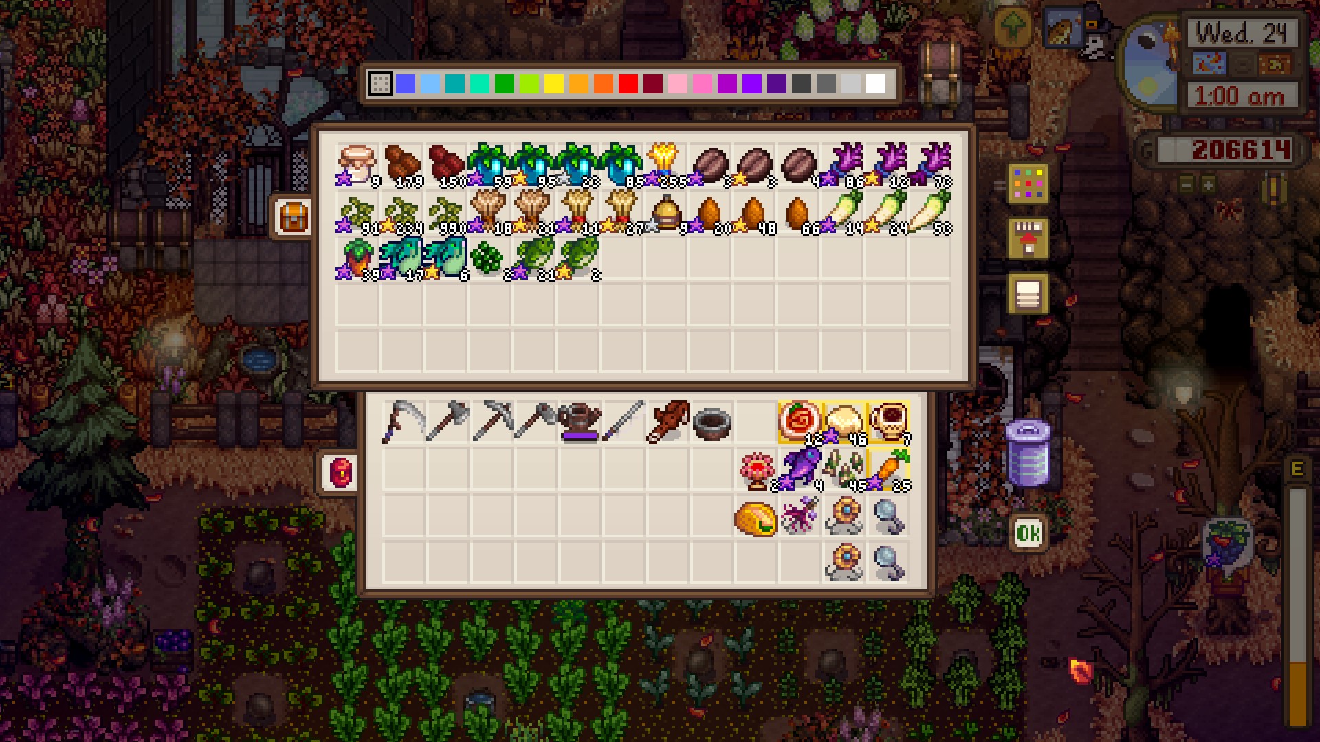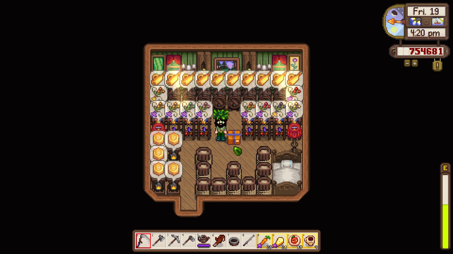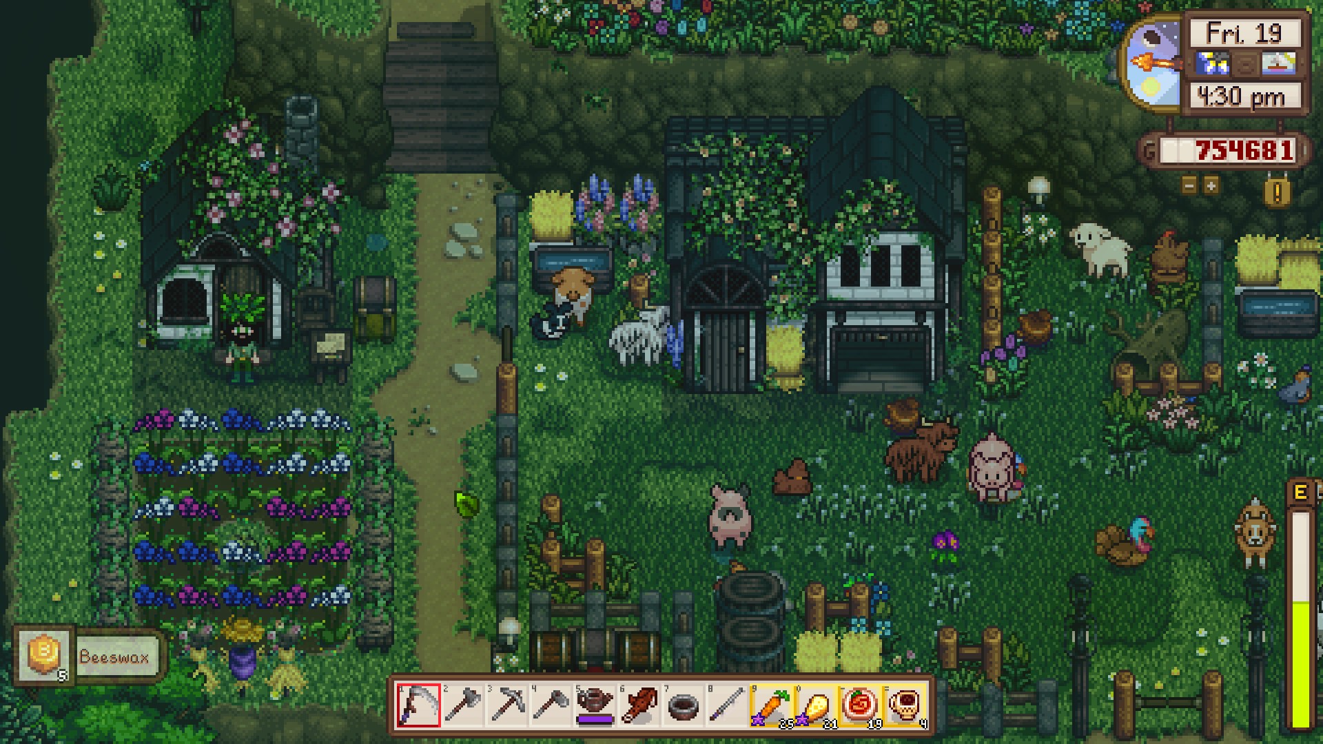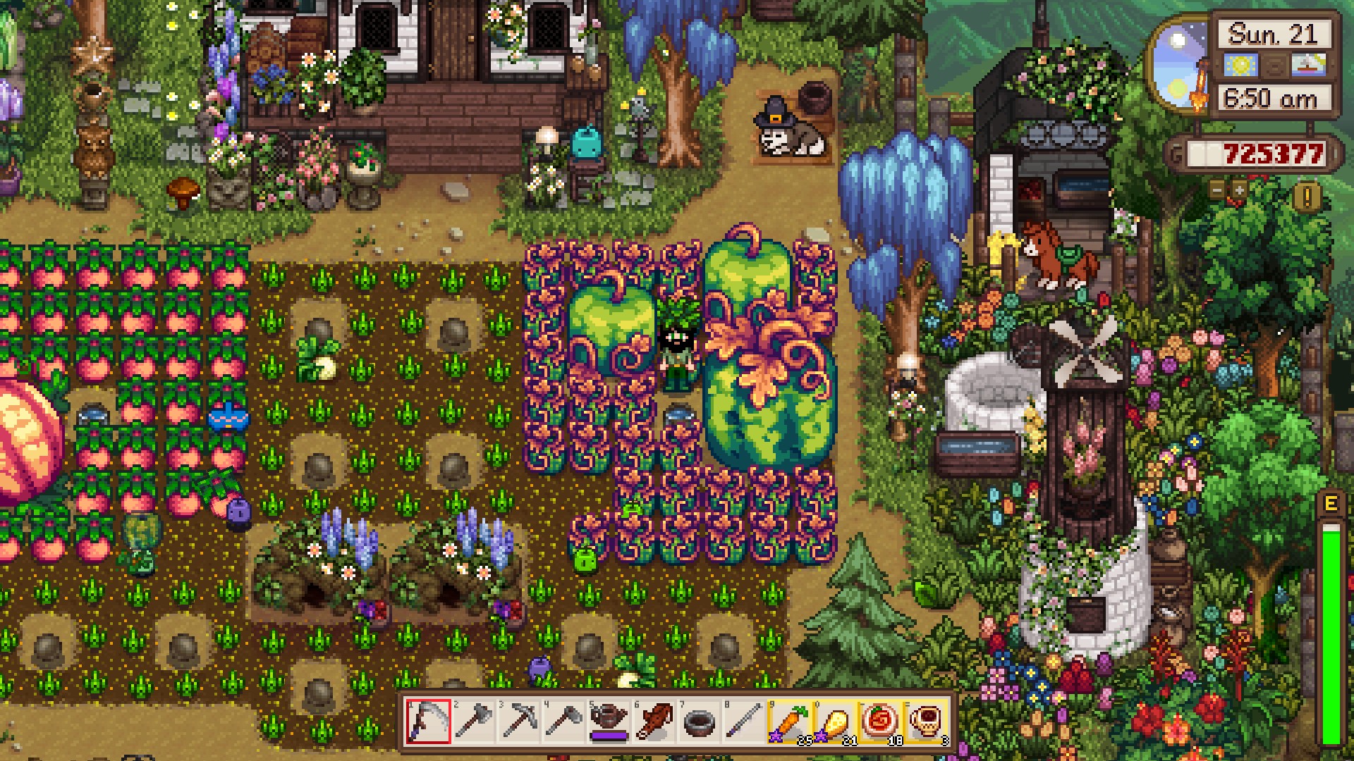 Watermelon and melons are good but not great, as their prices are already in the middle and decreasing every day. The highest value crops go into kegs, juicers, and preserve jars, of which I have 115, 30, and 30, respectively. Going to use that cabin on the left to set up eveything flower and honey related