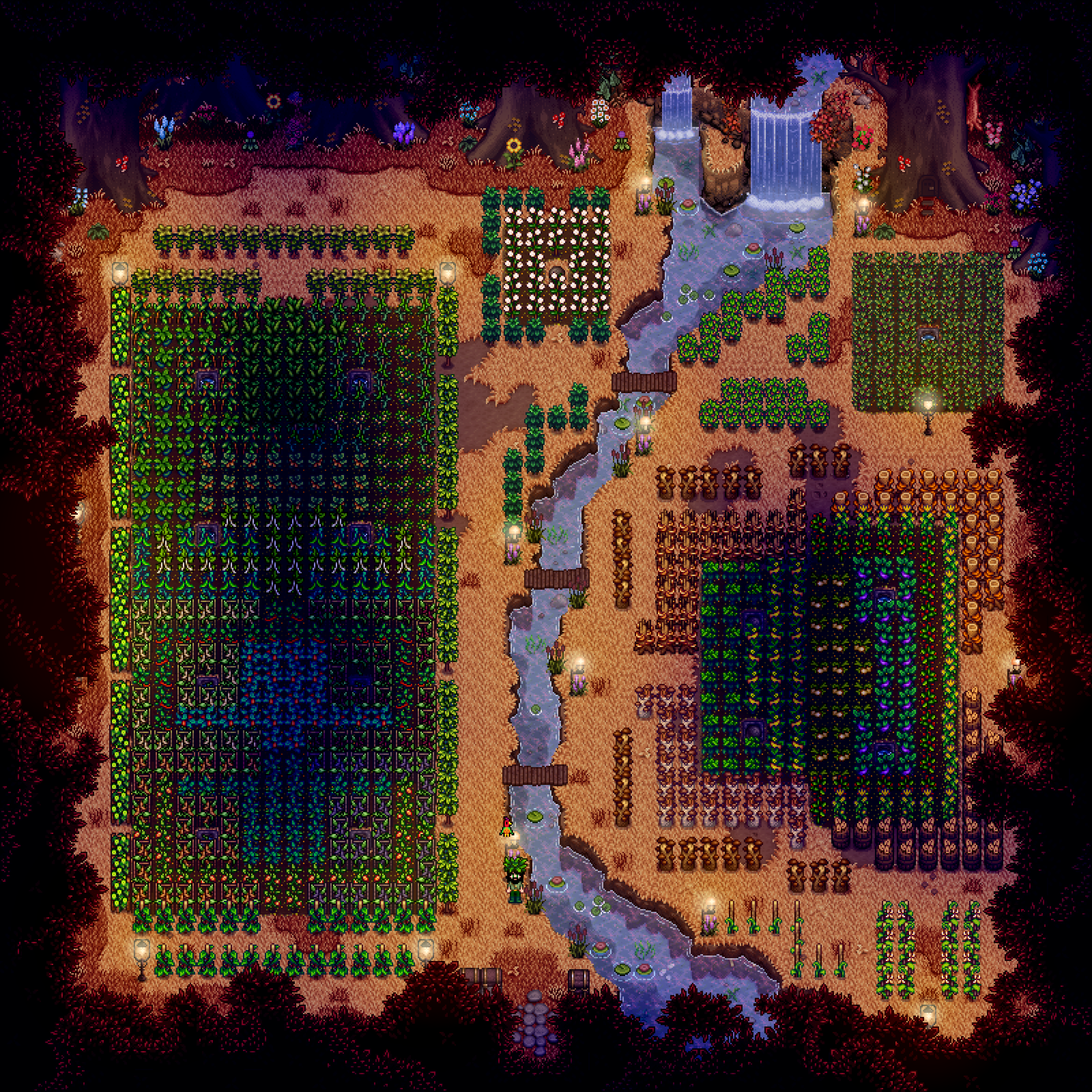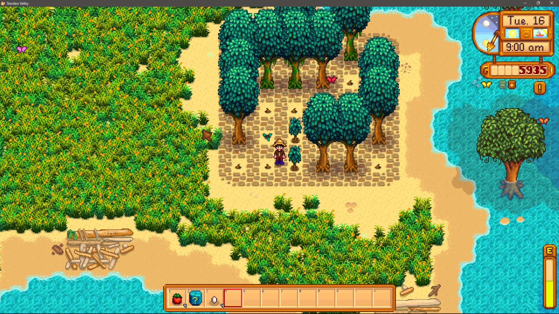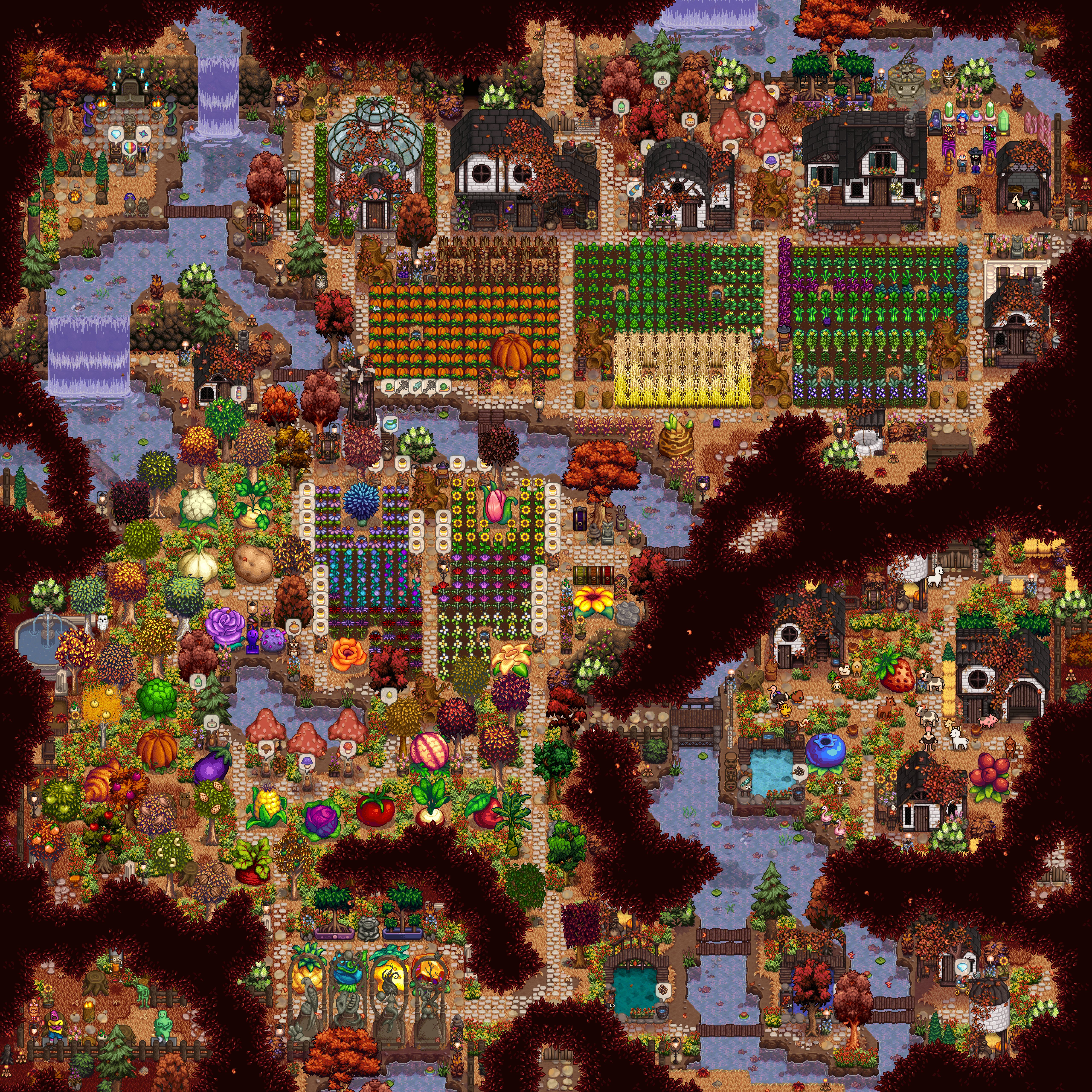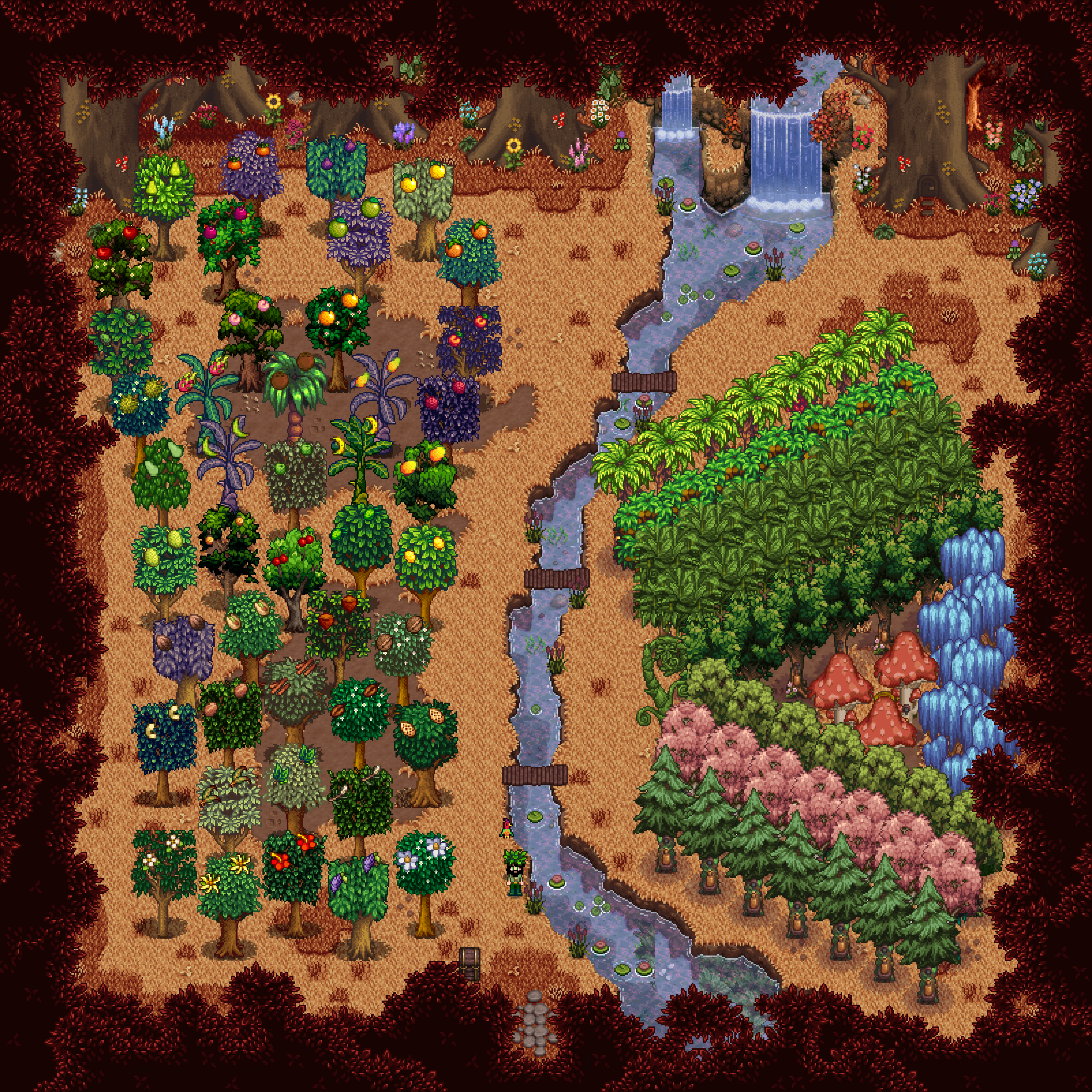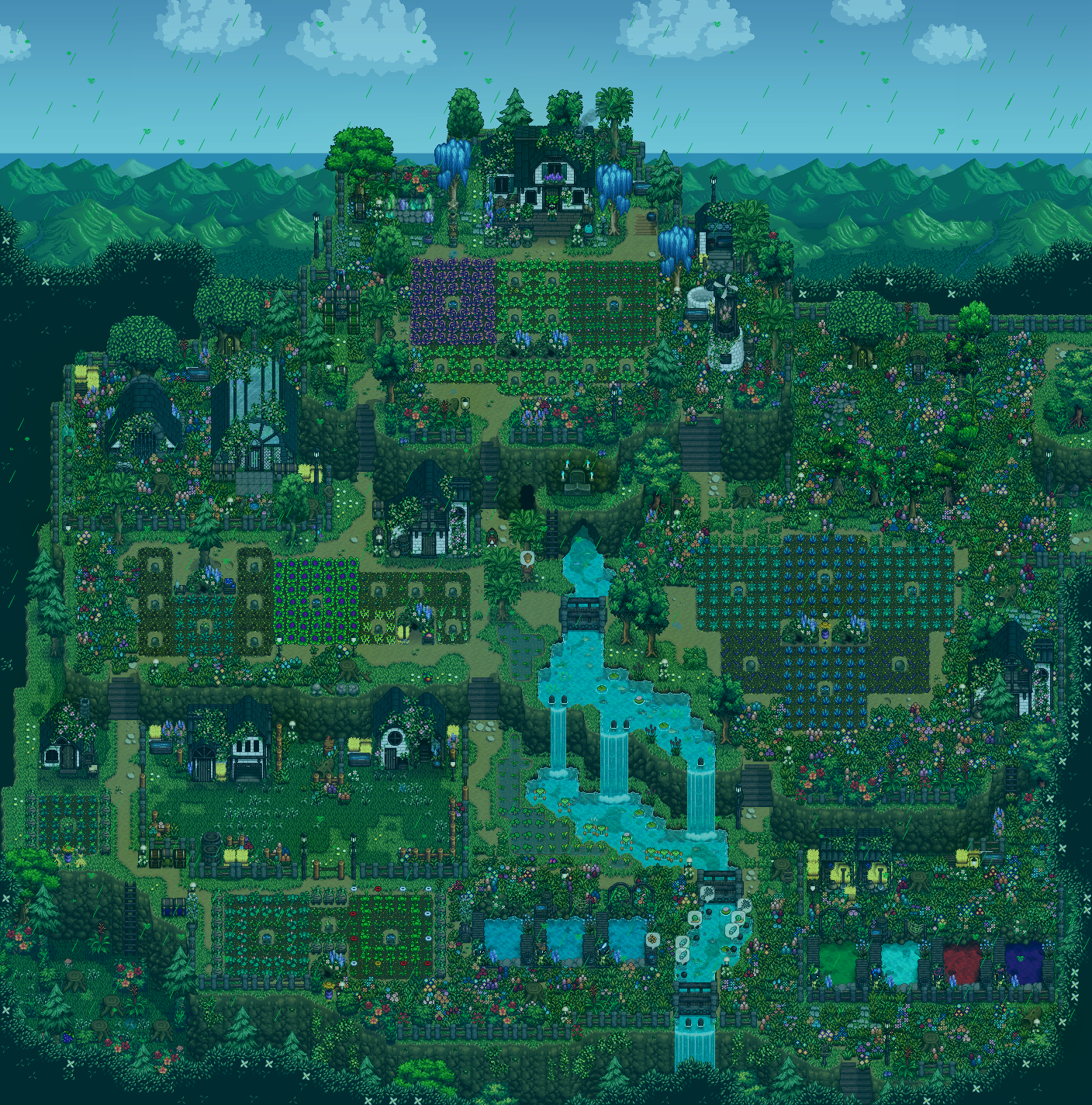 Watermelon and melons are good but not great, as their prices are already in the middle and decreasing every day. The highest value crops go into kegs, juicers, and preserve jars, of which I have 115, 30, and 30, respectively. Going to use that cabin on the left to set up eveything flower and honey related