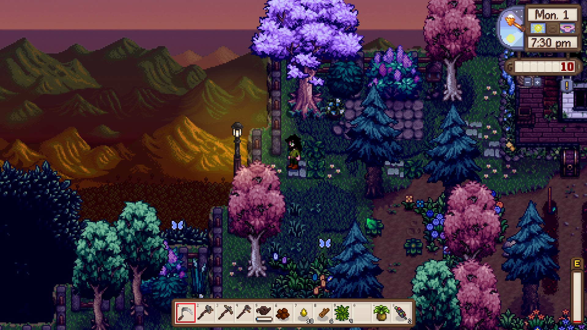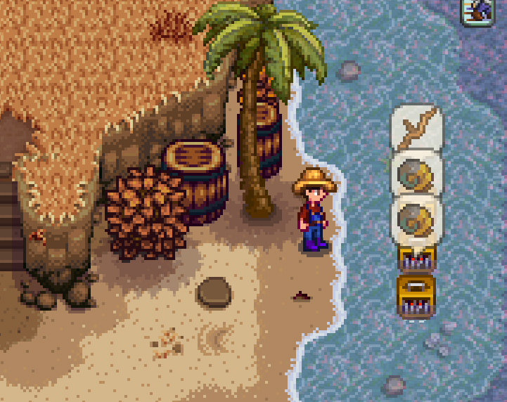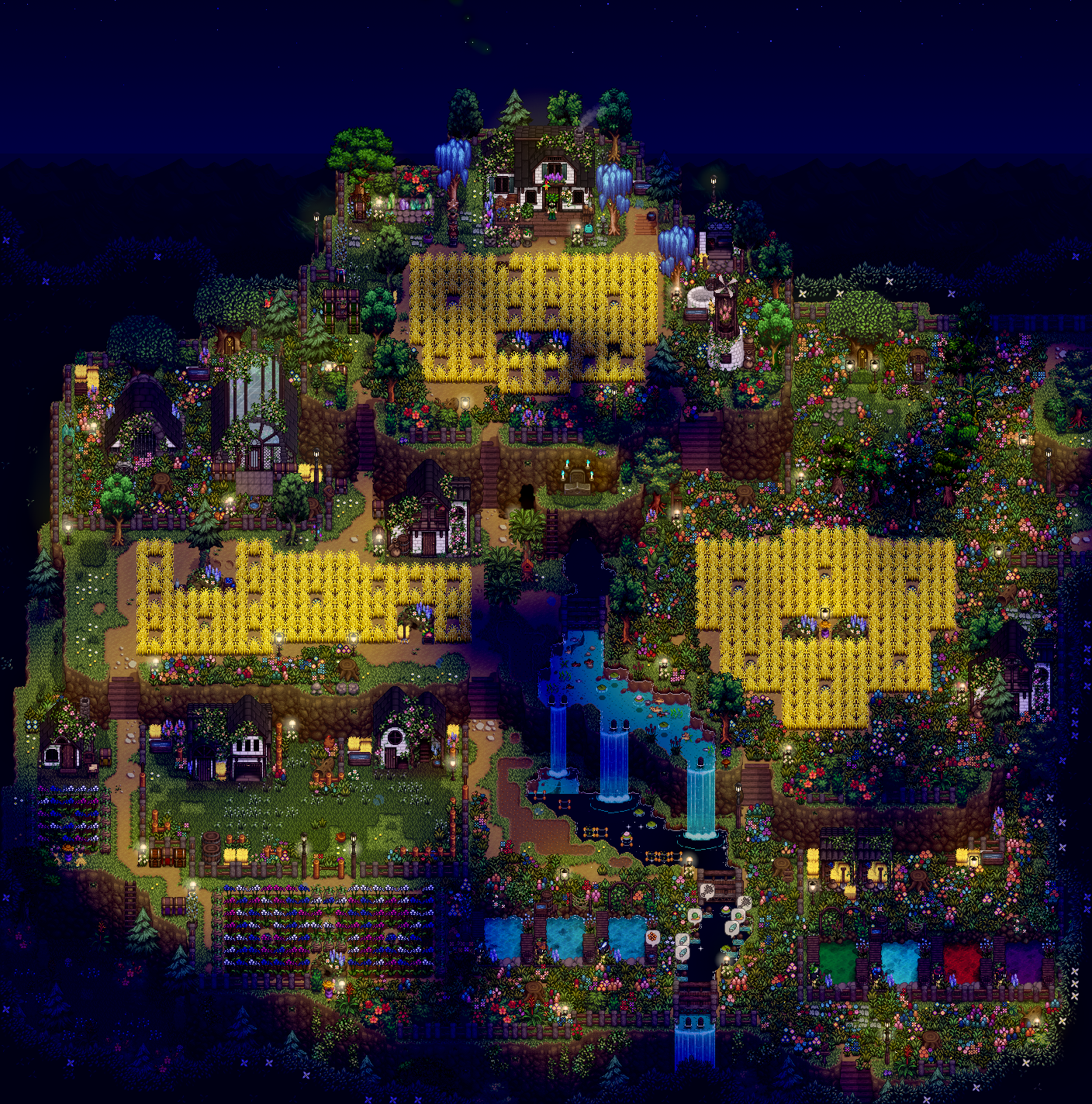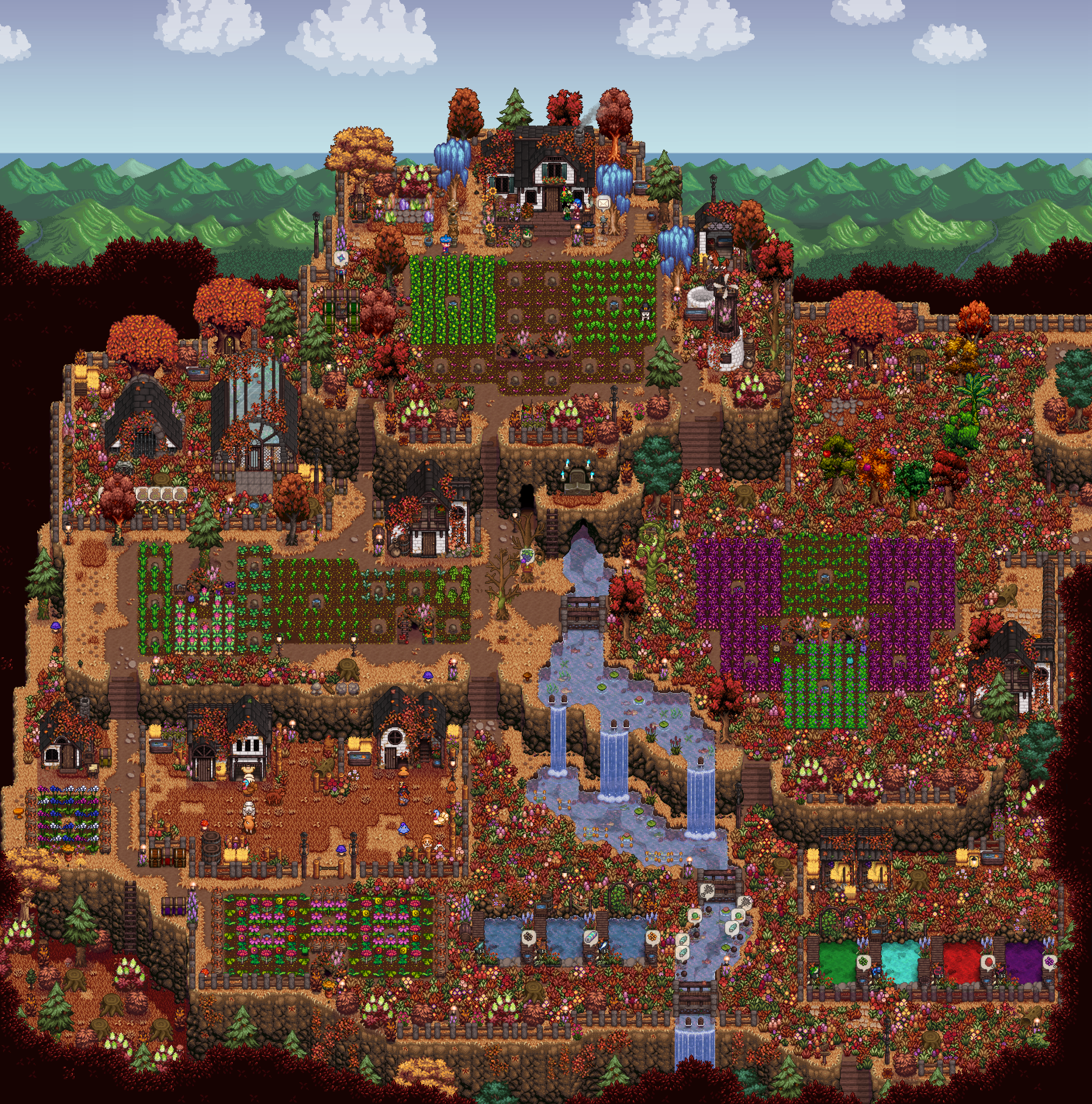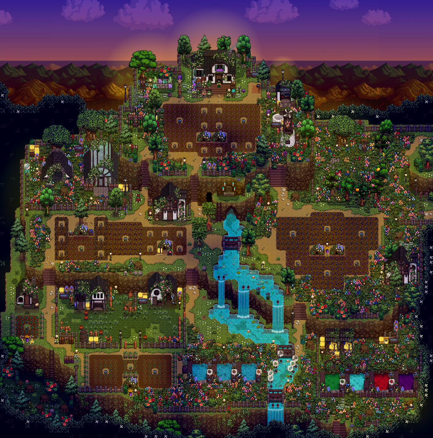 Watermelon and melons are good but not great, as their prices are already in the middle and decreasing every day. The highest value crops go into kegs, juicers, and preserve jars, of which I have 115, 30, and 30, respectively. Going to use that cabin on the left to set up eveything flower and honey related