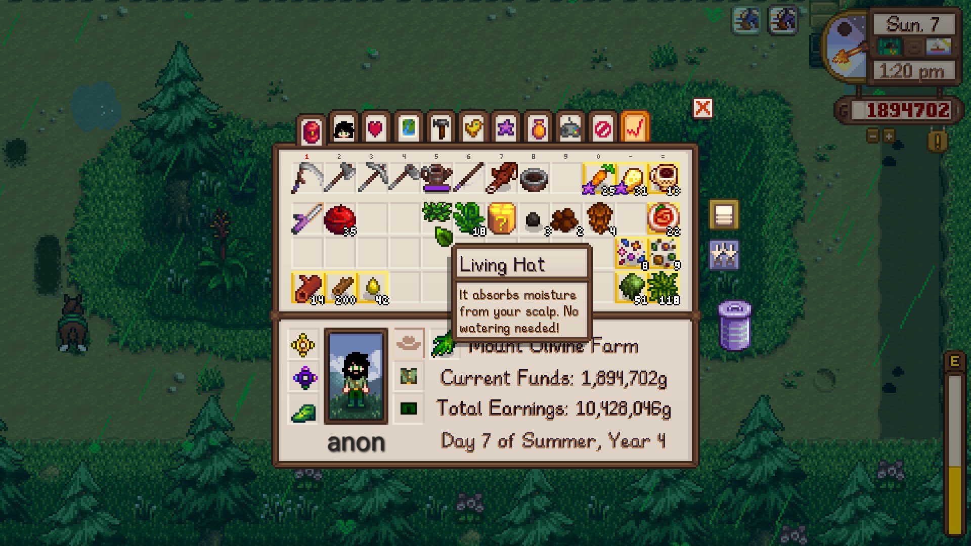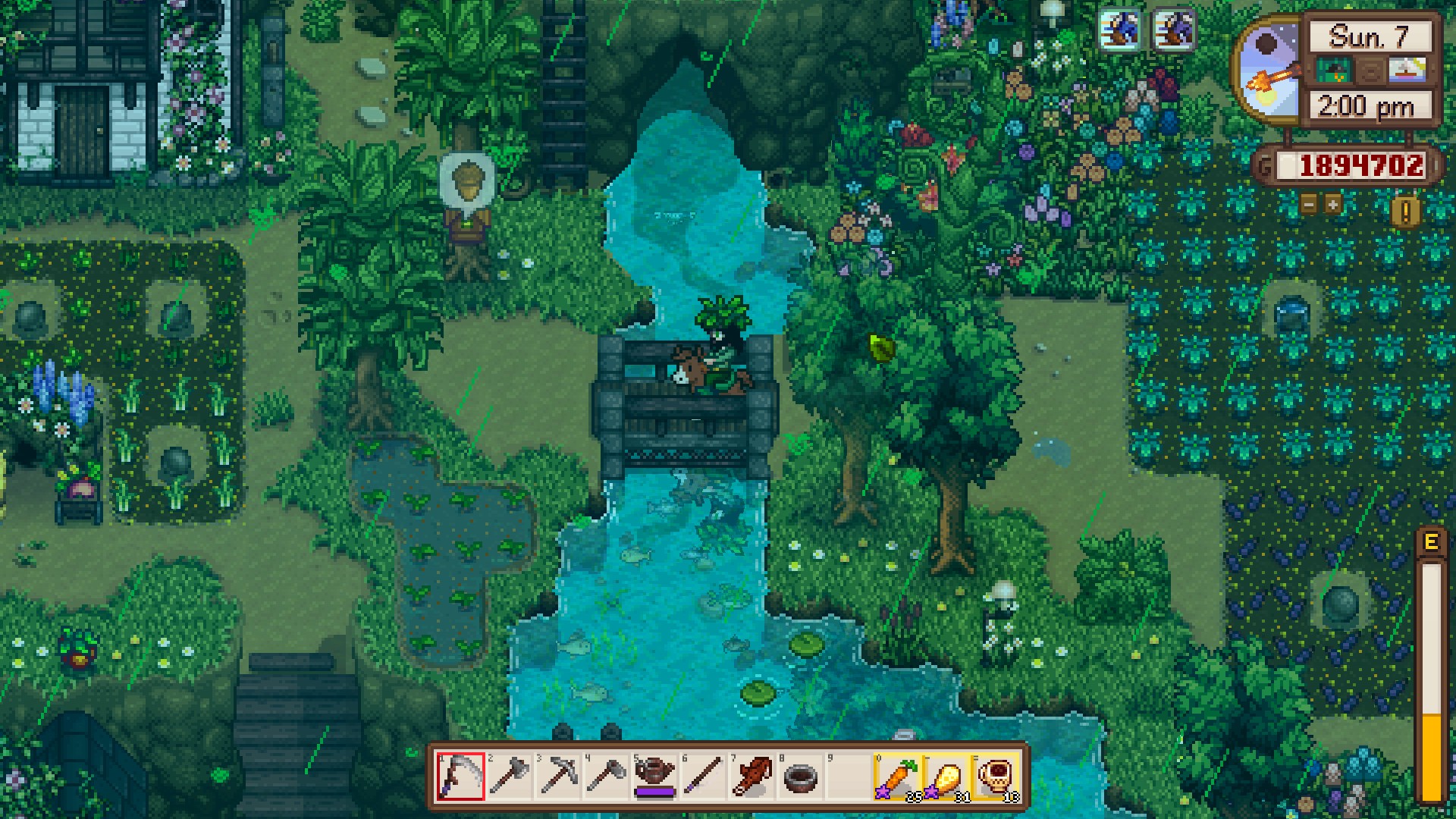 Another mod I really have been loving is weather wonders. It adds more types of weather to the game, some of which give negatives you have to work around. The very next day after I planted my summer crops, I was hit with a heatwave that dried up all the sprinkler water. Thus, I had to water 752 crops by hand.