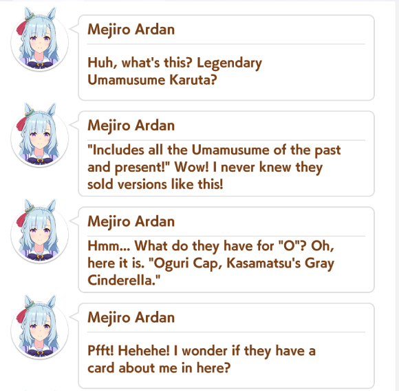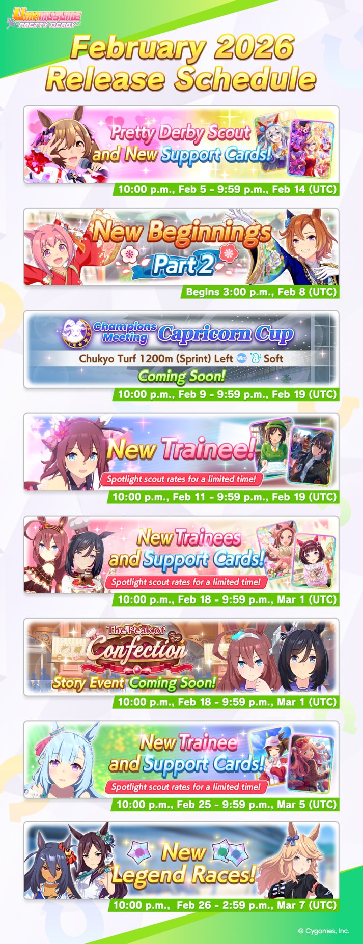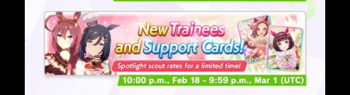 Previous: >>555828139>Global Game NewsLink your account to Cygames iDCurrent Scenario: Aoharu Hai aka "Unity Cup"Current Rate Up Trainee: New Year T.M. Opera O (3*), New Year Haru Urara (3*)Current Rate Up Support Cards: SSR Admire Vega (Power), SSR Matikanefukukitaru (Speed)Current CM: Capricorn Cup - Chukyo Turf 1200mMain Story Chapter 5 is out01/27 - New Beginnings Part 101/29 - NY Opera & Haru 3*+Fuku SSR+Ayabe SSRMid February - Capricorn Cup - Chukyo Turf 1200mhttps://umamusume.com/news/100040/https://pages.snep.pw/uma/anni-skill-changes/>JP Game NewsCurrent Rate Up: Valentine Taiki Shuttle (3*), Valentine Sounds of Earth (3*), SSR Matikanefukukitaru, SSR Neo UniverseNew Scenario "Yukoma Hot Spring" releasedTimeline: https://uma.moe/timelineCygames Webstore: https://webstore.cygames.com/en/umamusume_en/>Thread Clubshttps://rentry.co/umaglobalclublistYou must be E3 (20k points) to join a circle. Apply with /uma/ or /vg/ in your profile or post ID in the thread.>All Guides & Resourceshttps://rentry.org/uma26Game databasehttps://gametora.com/umamusume (Click the gear to switch between JP / global server info)A basic guide for newfagshttps://rentry.org/umaglobalFind networks if your region is blocked from the game or clienthttps://www.umavpn.top/93Seiyuu & Concertshttps://rentry.org/umstUma Texthttps://umareader.idsmile.xyz/