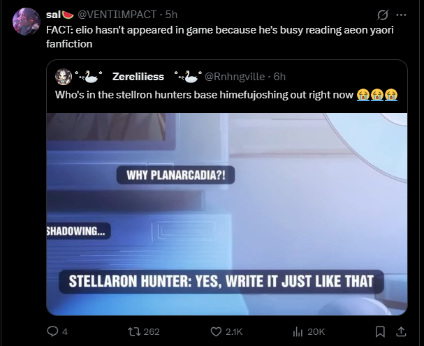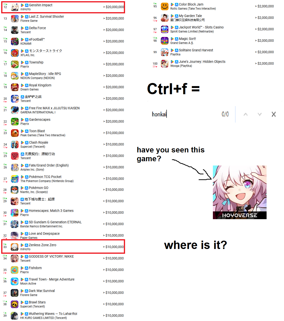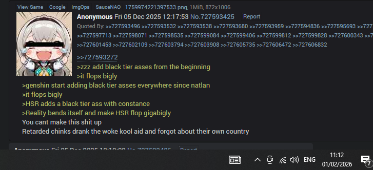 HSR is just that relevant, shitposters can’t help it but cry about us 24/7 >>555900450Mihoyo’s IP is strong, ZZZ survived only because of Hoyo IP. If it had launched without it, ZZZ would’ve only made around Endfield numbers at launch
