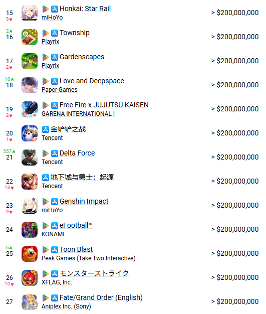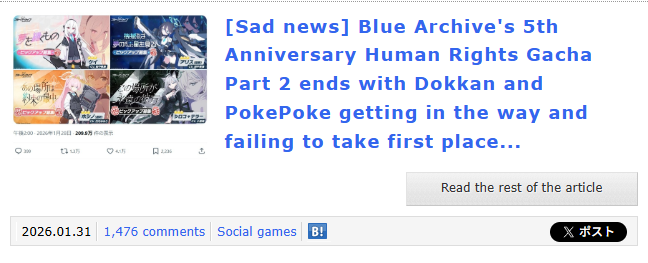 Top 10 Gacha revenue Jan 2026:Genshin: 66,04m (12m CN IOS; 1m CN IOS Cloud)Naruto: 44m (16m CN IOS)LnDS: 35,72m (8m CN IOS; 80k CN IOS Cloud)PTCGP: 35mFGO: 33,35m (1m CN IOS)Endfield: 29,55m (6m CN IOS)Monster Strike: 27,5mZZZ: 23,245m (3m CN IOS; 700k CN IOS Cloud)Gundam Eternal: 19mNIKKE: 18,65m (1m CN IOS)WW: 18,15m (2m CN IOS; 600k CN IOS Cloud)HSR: 8,0375m (1m CN IOS; 90k CN IOS Cloud)Arknights: 16,95m (3m CN IOS)