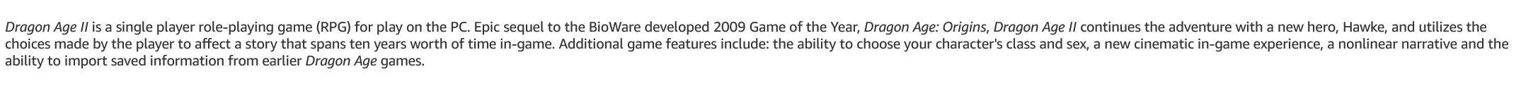 >Dragon Age: Origins is a 2009 role-playing video game developed by BioWare and published by Electronic Arts.