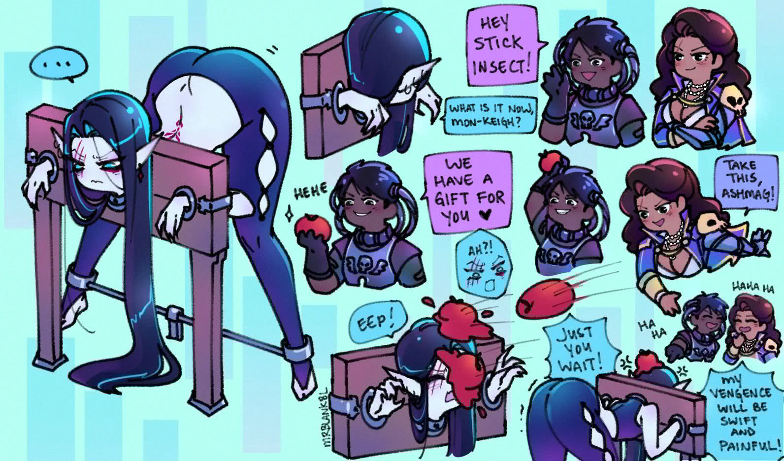 What would be the best way to upset raz: redraw his art but better or draw his character and yirlet being dismembered? What if I draw her being taken from behind and then throat slit when she climaxes, while raz helplessly watches chained to the bed?