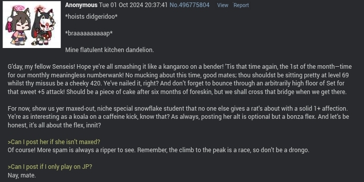 *hoists didgeridoo**braaaaaaaaaap*My flatulent kitchen dandelion.Bad morning my fellow Sensei[sic], check your colanders because it is indeed that time again. 1st of the month, time for the monthly meaningless numberwank! This month theirs no excuses or free passes, you should be level 69 and your wife should be 420. You did it, right? And don't forget to clear an arbitrarily high floor of Set for that sweet +5 attack! This should be fairly easy thanks to 6 months of foreskin but well worry about crossing that little bridge next time. For now please post your maxed and extremely niche special snowflake student that nobody else likes with 1+ affection. Your such an interesting person, do you know that? As usual including her alt is optional but a nice flex. And this is all about flexing, right?>Can I post her if she isn't maxed?Of course. More spam is always a joy to see. Remember the climb to the peak is a race.>Can I post if I only play on JPNo.