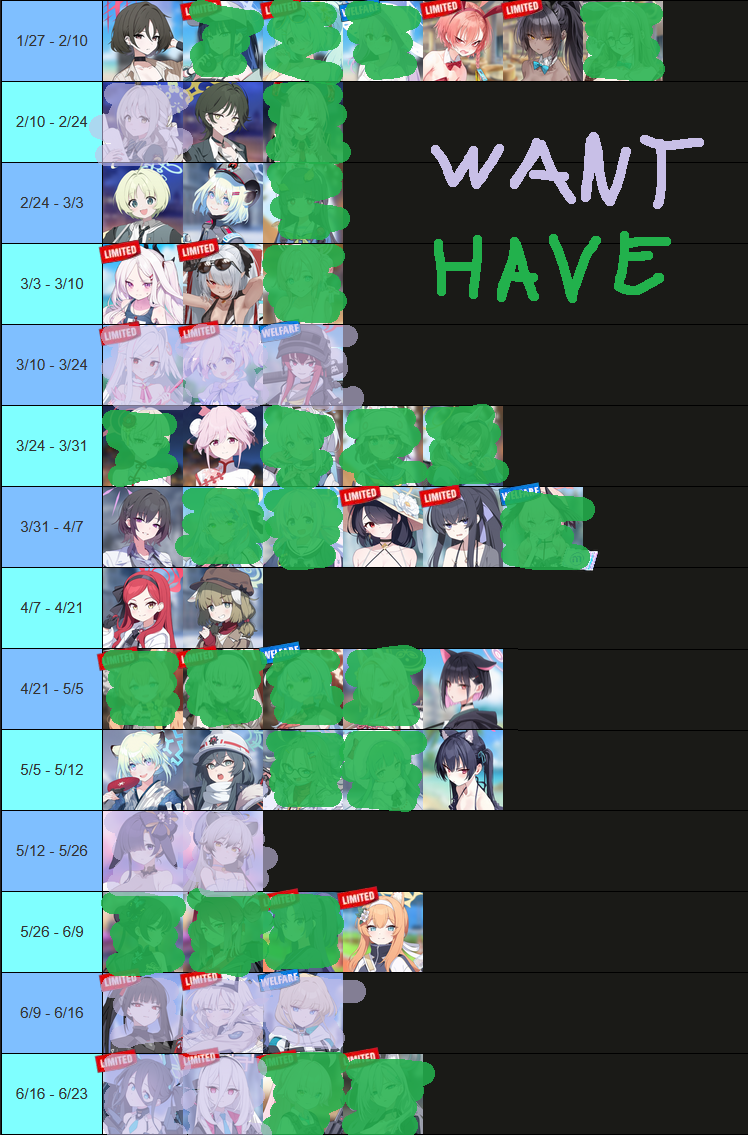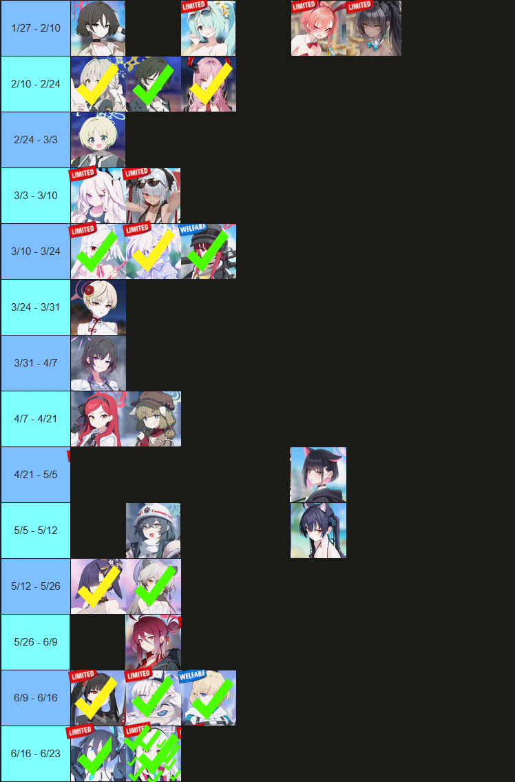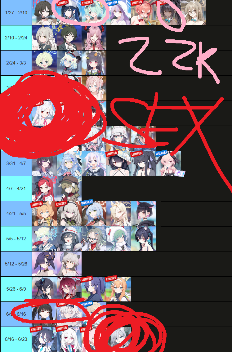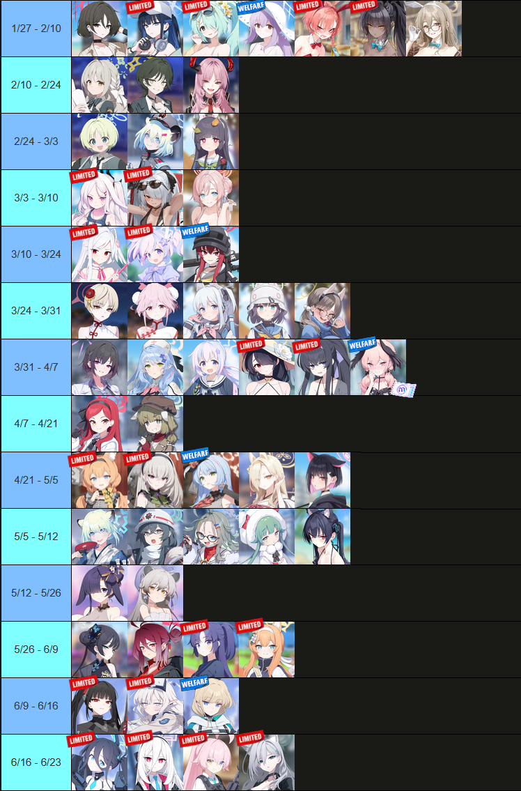 Previous Thread: >>555927938>Guides, Resources and useful links:https://rentry.org/bagguides>/bag/Circles/Clubs/Friends:https://rentry.org/holdingthebag>4koma, Manga, Side Content, PVs & Shortshttps://rentry.org/bacontent>>(JP) – JST>Banners:>1/29 After Maint – 2/5 10:59Aris (Battle – Limited)Kei (Limited)Hoshino (Battle – Limited)Shiroko*Terror (Limited)>News:Patch notes: https://bluearchive.jp/news/newsJump/624>Events:Steel Continent Assault: Malkuth Battle – 1/29 After Maint – 2/12 10:595th Anniversary Login Bonus – 1/20 After Maint – 2/12 10:59>Content:Joint Firing Drill (Defense) – 1/29 After Maint – 2/5 3:59Limit Break Assault: Chokmah (Field w/Special Armor) – 1/21 11:00 – 2/12 3:593x Bounty/Normal/Hard – 1/29 4:00 – 2/5 3:593x Commission/Lesson – 2/5 4:00 – 2/12 3:592x Account EXP – 2/7 4:00 – 2/9 3:59>>(GLOBAL) – UTC>Banners:>1/27 After Maint – 2/10 1:59Misaki (Swimsuit)Saori (Swimsuit – Limited)Hiyori (Swimsuit – Limited)Neru (Bunny – Limited)Karin (Bunny – Limited)Akane (Bunny)>News:Patch notes: https://forum.nexon.com/bluearchive-en/board_view?thread=3355429>Events:Sheside outside – 1/27 After Maint – 2/10 1:59The Arius District's Emergency Class Mission – 2/3 2:00 – 3/10 1:59My Office: https://bluearchive.nexon.com/user/myoffice>Content:Joint Firing Drill (Shooting) – 1/27 2:00 – 2/2 18:59Grand Assault: Chesed (Field – Torment w/Elastic Armor) – 2/3 2:00 – 2/9 18:59Limit Break Assault: Chokmah (Field – w/Special Armor) – 1/14 2:00 – 2/9 18:592x Lesson/Scrimmage – 1/26 19:00 – 2/2 18:592x Commissions/Hard – 2/2 19:00 – 2/9 18:592x Bounty/Scrimmage – 2/9 19:00 – 2/16 18:592x Account EXP – 2/13 19:00 – 2/15 18:592x Normal – 2/16 19:00 – 2/23 18:592x Account EXP – 2/20 19:00 – 2/22 18:59
