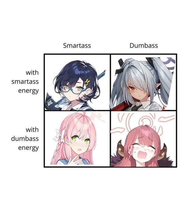 >>555973284Good with kids.Sleepy brat.but can put the effort and skill in when needed.Twin tails and pantyhose.