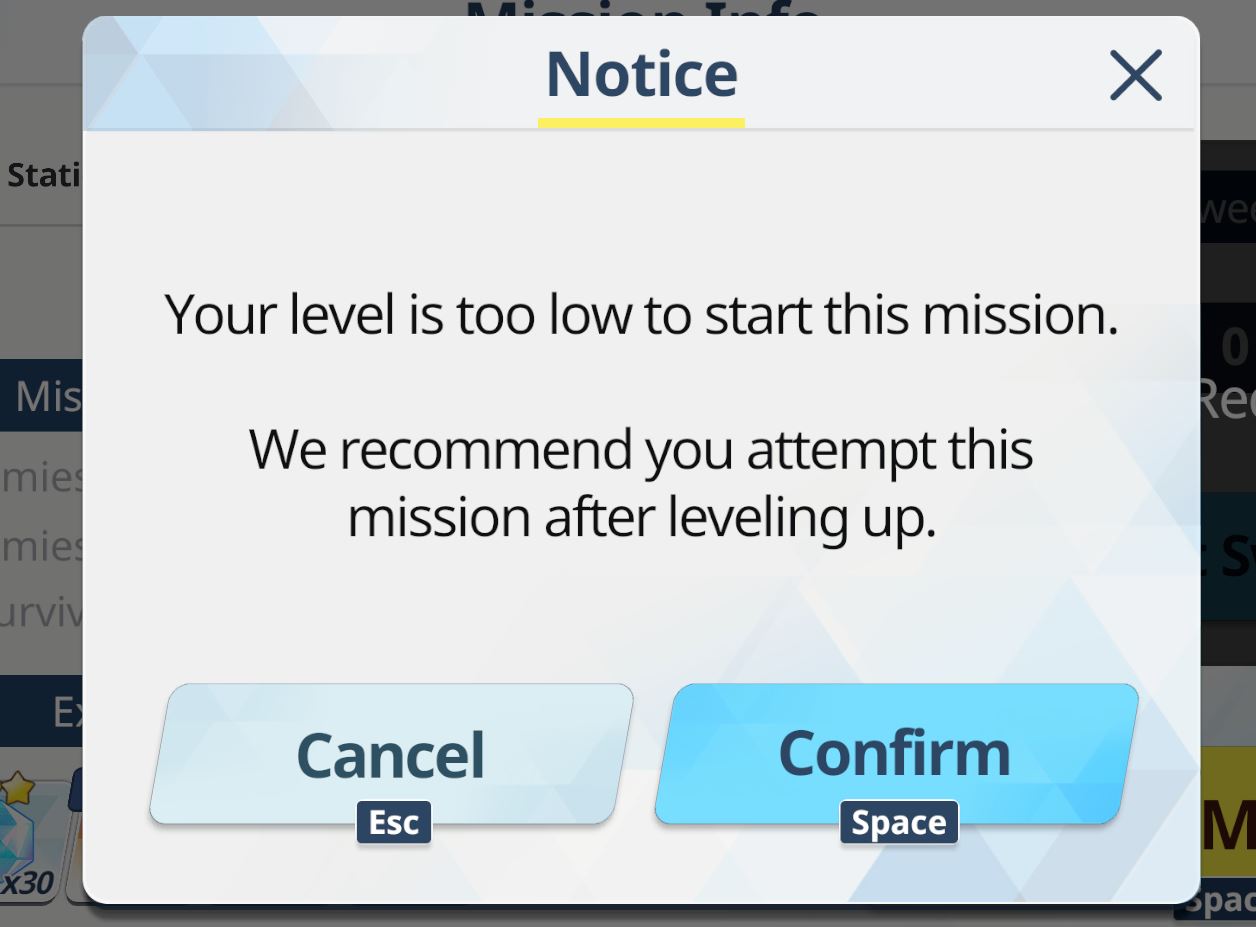 >>555972902you can still do the mission if you click confirm. depending on the level gap it might not be too hard, if you don't play on auto missions about 25-30 levels above yours are doable