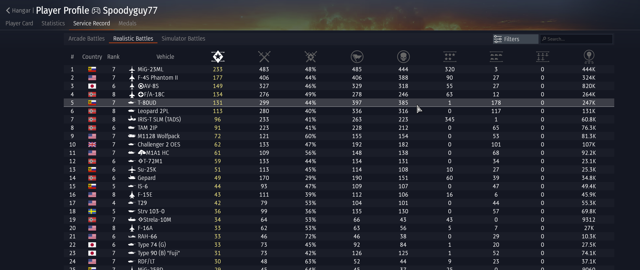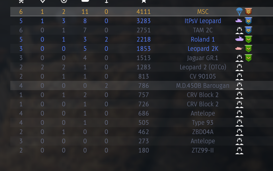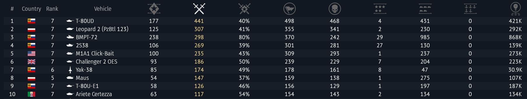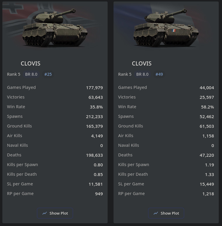 >>555982981I have pretty much every nation maxed out more or less. I rotate through looking for the maps I like, in ground. I rotate through looking for dowtiers, in air.That's my way of playing this game lately.