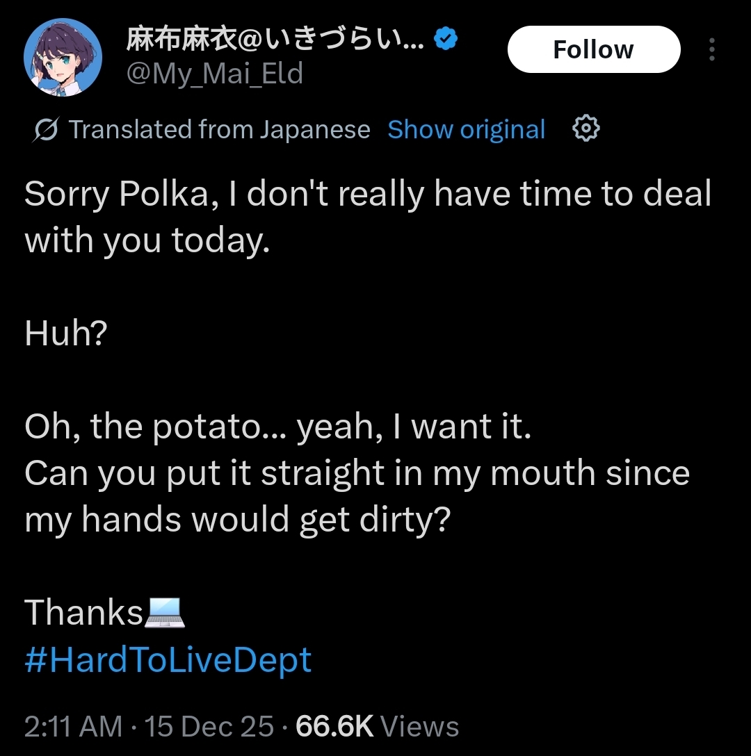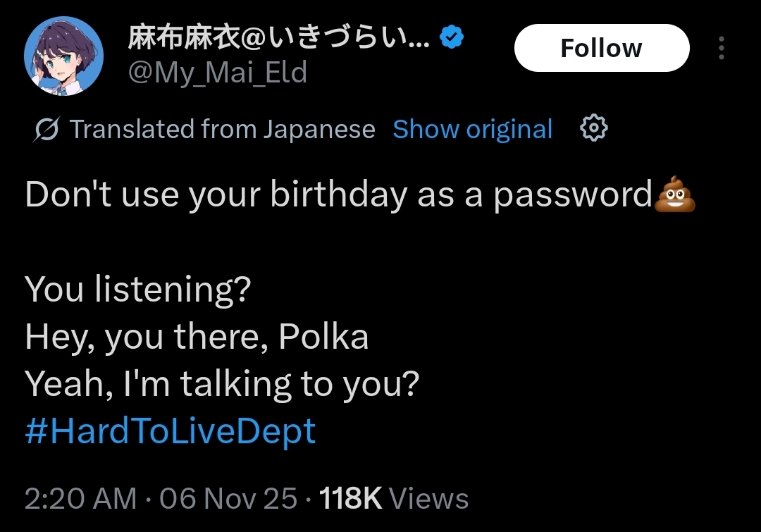 >>555970997She's a computer autist, so she probably thinks it's easier to tweet it out and have Polka see it on her timeline than to simply turn her head and tell her herself.