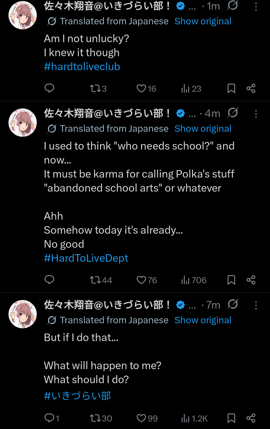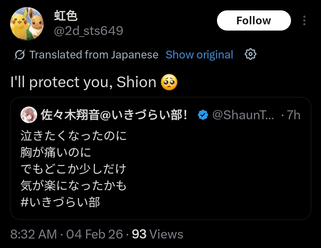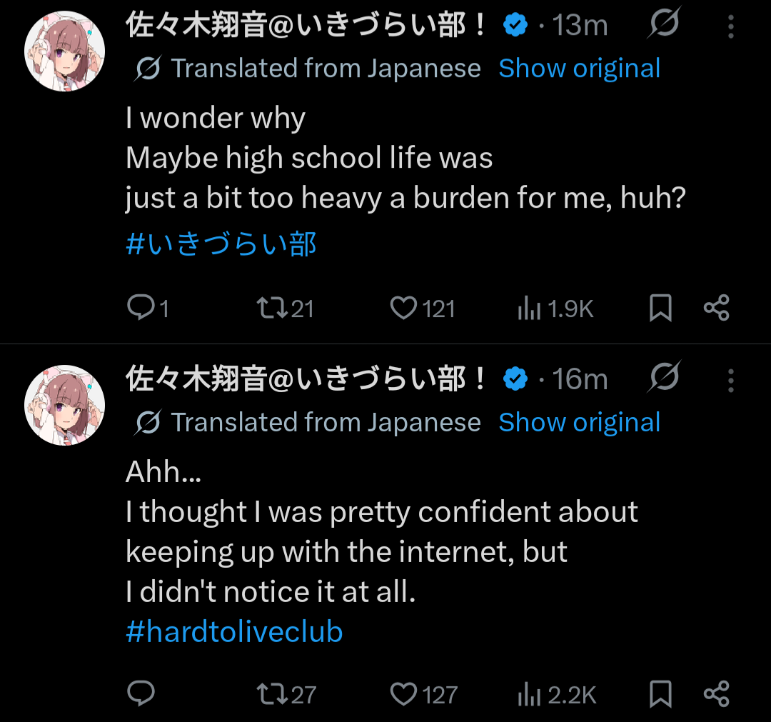 >>555969013Shion's recent tweets honestly capture the vibes of a self-destructive shitposting teenager. I like that they've been leaning into that angle after her tweet about puns being stupid made the rounds. Every "I'm gonna kill myself" rant ending with "Love you all" is just perfect.