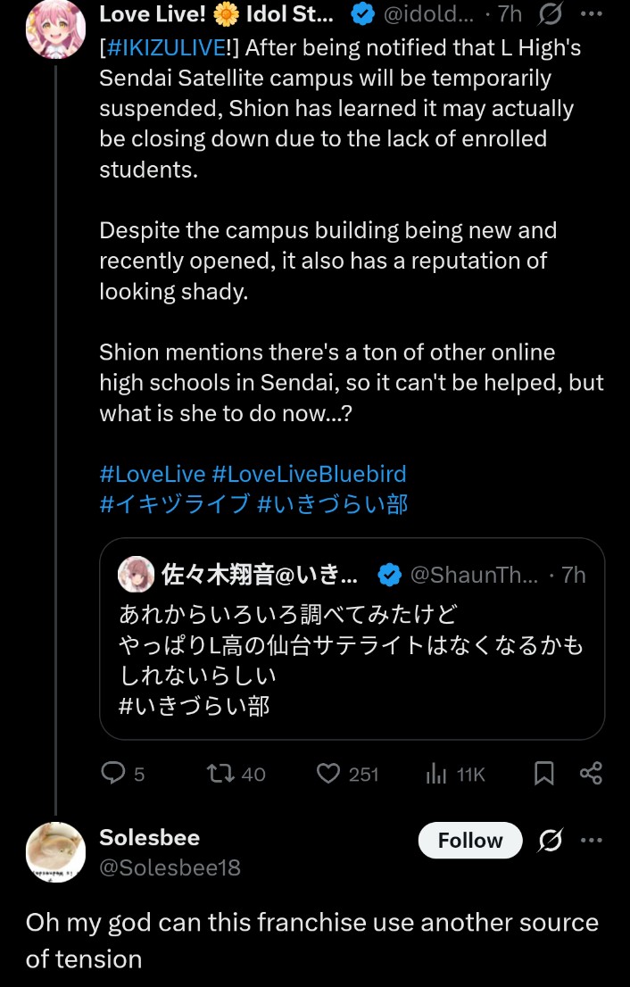 Love live just needs a better road map. Half the time we dont know what the fuck the goal is with our own groups. I give hasu a pass like sure we dont know what happens after grads but thats ok, we have a timeline of events and when to expect things to happen. Niji is ok, movies are an obvious commitment then you have the low effort AS continuation which im not a fan of. Would rather they just release AS as an offline version on the app store. Liella is just??? After s3 there is no hint what we can expect or look forward too aside from lives