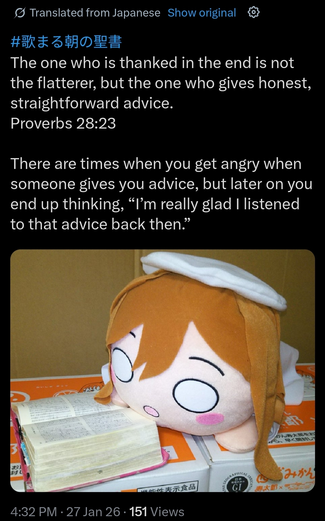 >>555969013Yukuri has had one interesting tweet and it's the one saying that we can die at any moment.