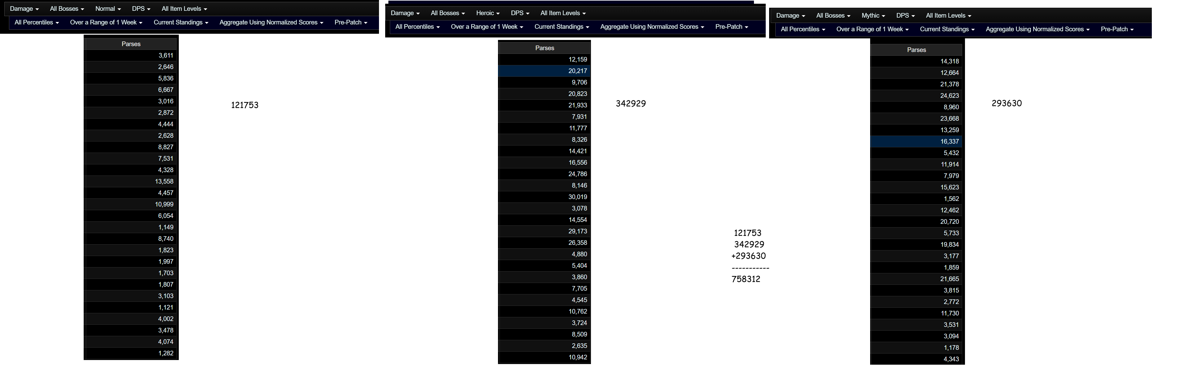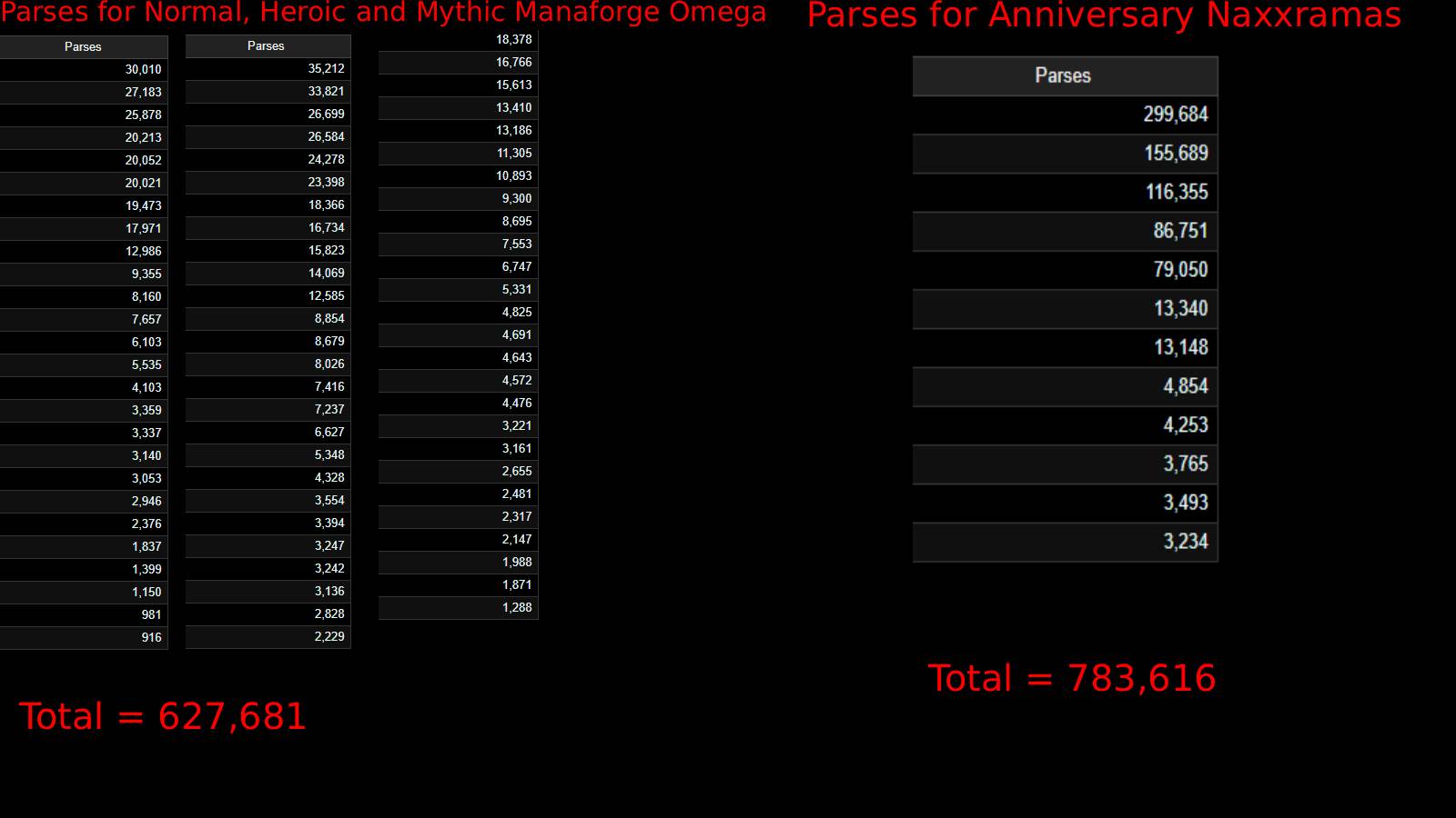 >>556001964so this anon used the last 2 weeks of the 11.2.5 as his data point, while using current naxx numbers. screenshot and clipped is the most recent single week of prepatch. in 2 weeks classic naxx has 783616 or whatever. in 1 week of prepatch we had 758312. i didn't bother counting 2 weeks since a lot of people didn't bother with the previous week due to setting up uis and stuff. tldr-quit being a tranny and trying to lie