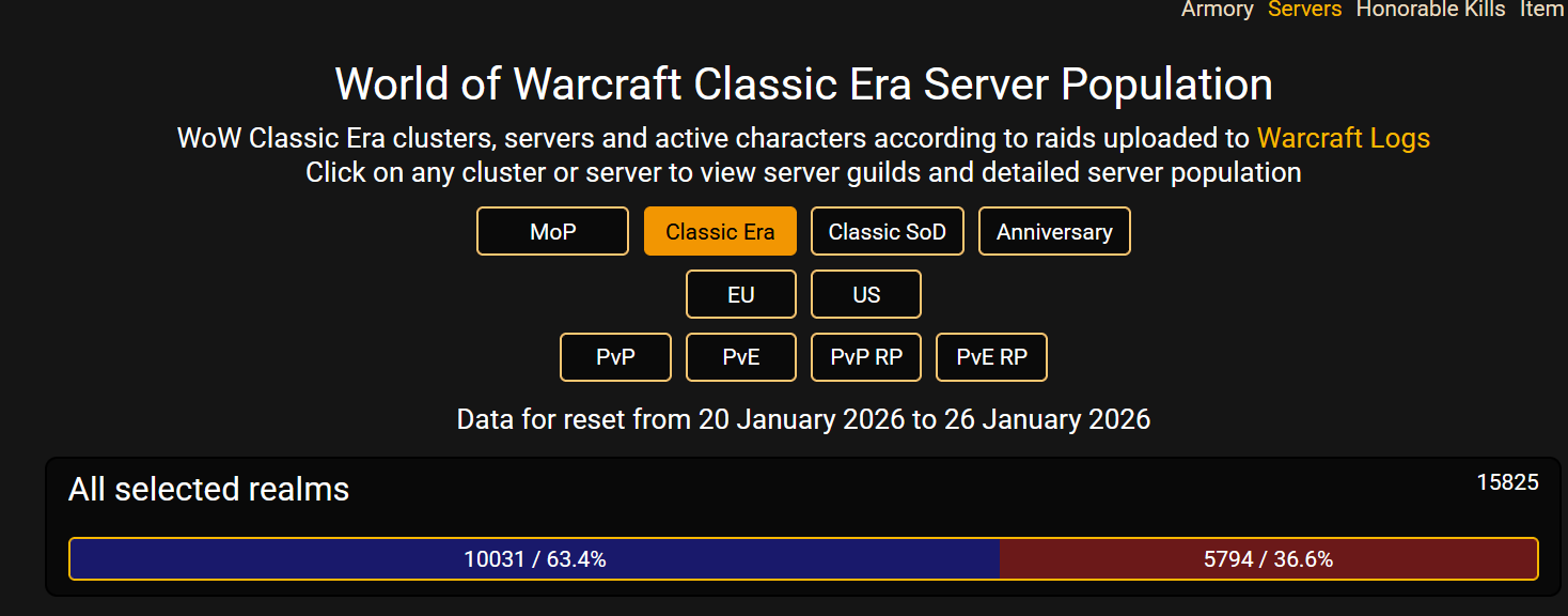 >>556002169I would swap to classic in a hearbeat if I knew the server wasn't going to be discontinued or move on to a new expansion.I think theres a lot of people like me that are waiting for Classic +I wonder how the retail population will go once they finally announce it.