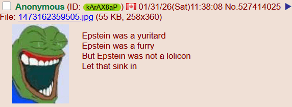 >>556017482>>556019208i am eternally grateful that he got whacked in 2019, because if he had lived to 2021 there would have been a real nonzero chance that i had interacted with a goat or doeposter that was actually unironically literally epstein and that's a terror that i am glad is not in my life