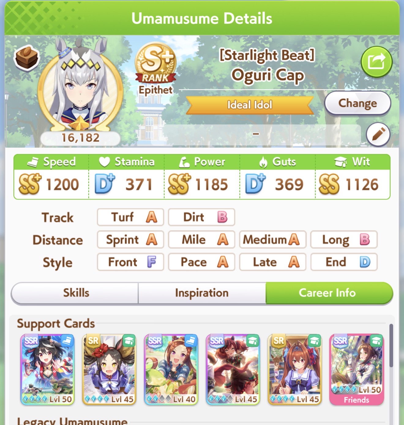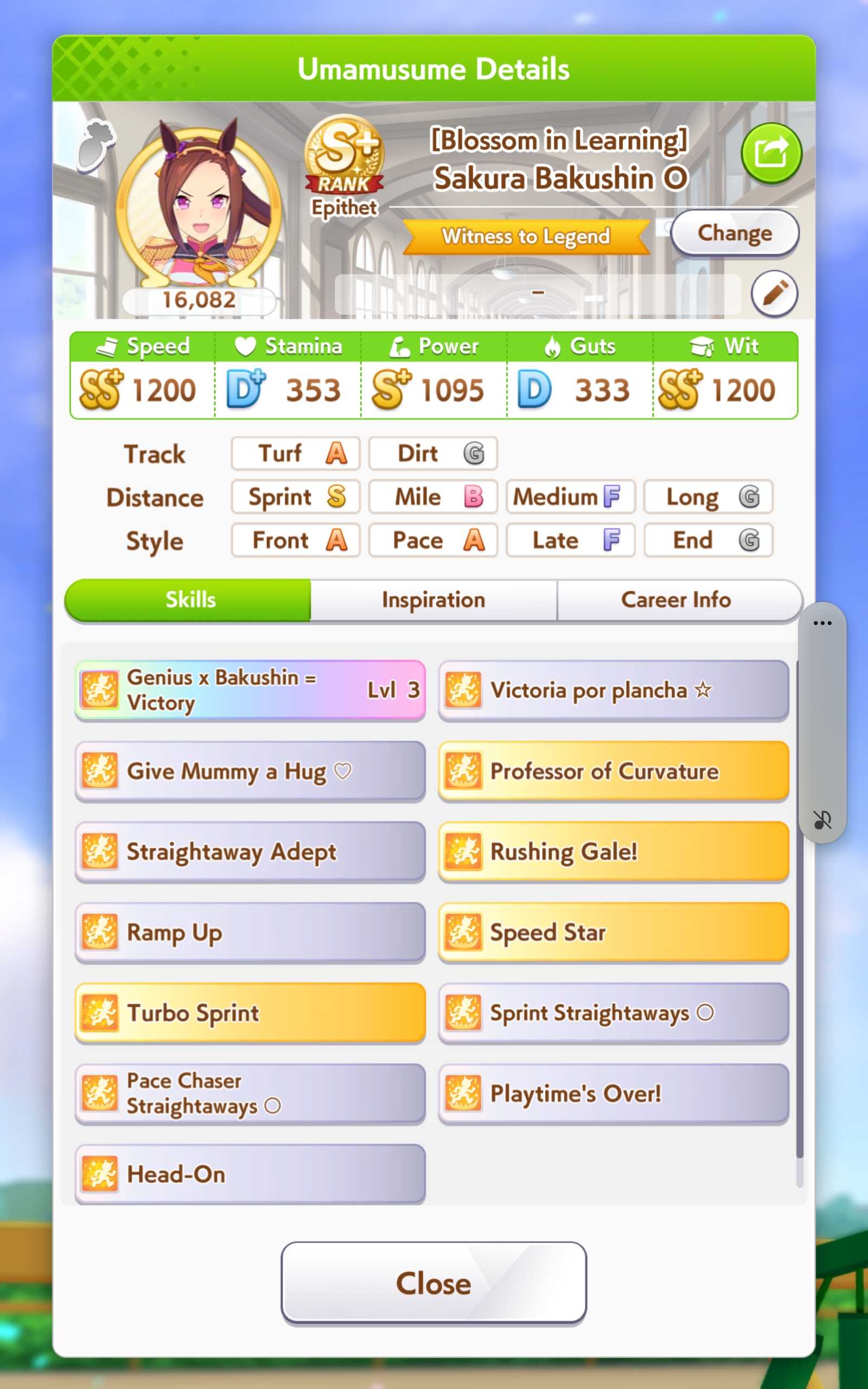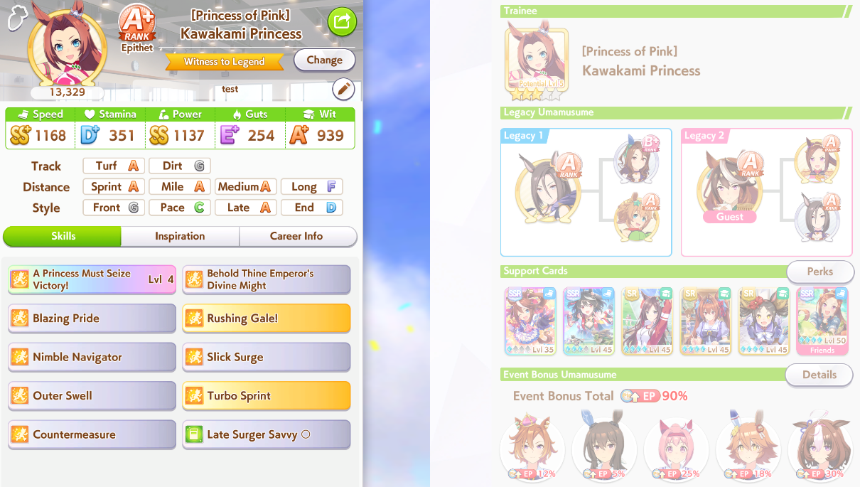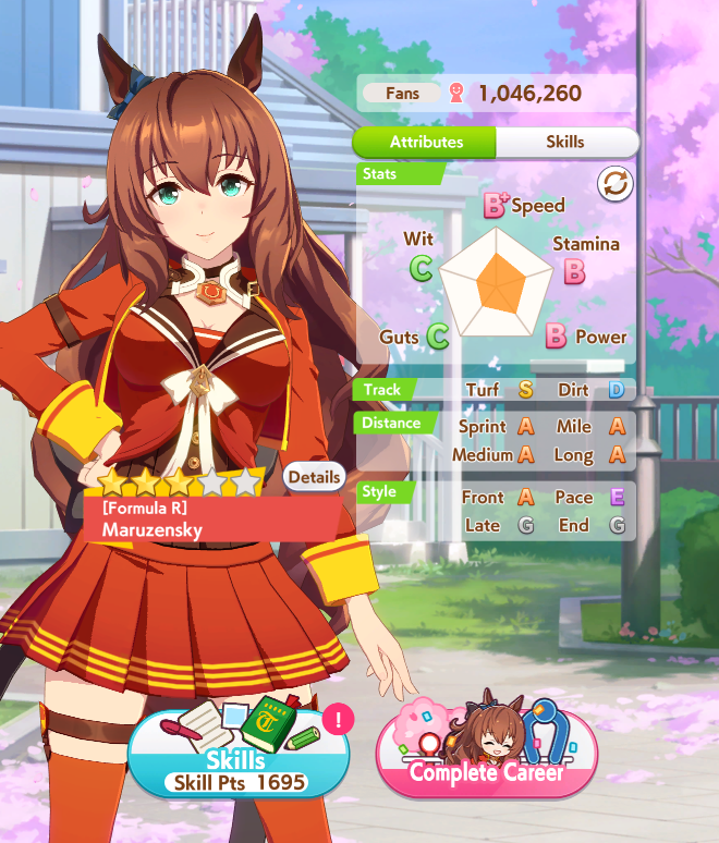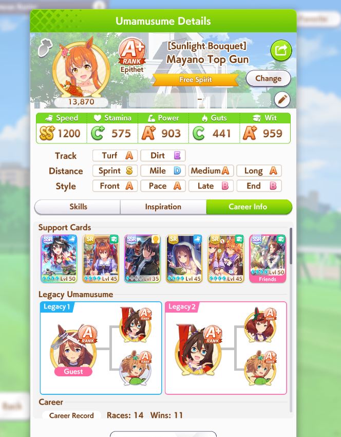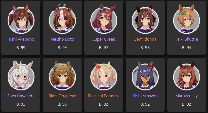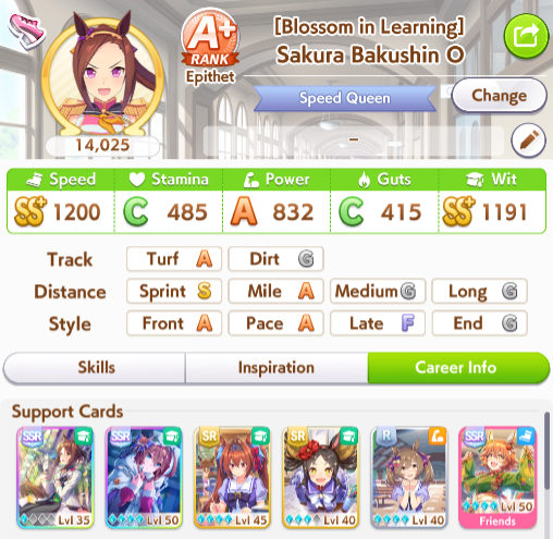 >>556012131>does princess have a stamina recovery unique?Nah, her ult is basically Bakushin ult where instead of being challenged in the second half of the race, it's being challenged on the final straight.>if not stam+guts looks low (I always try to hit 700)On sprint as a late surger? I've seen people say Akebono never gets to trigger ult because you need to be drained of stamina and you naturally get more stamina than you need in a normal career run. I could be wrong, but I'm also out of borrows for the day lmao so that's where I get to test until tomorrow.