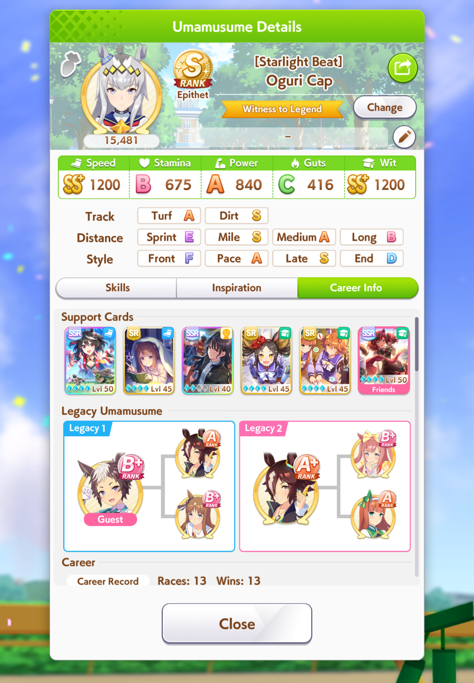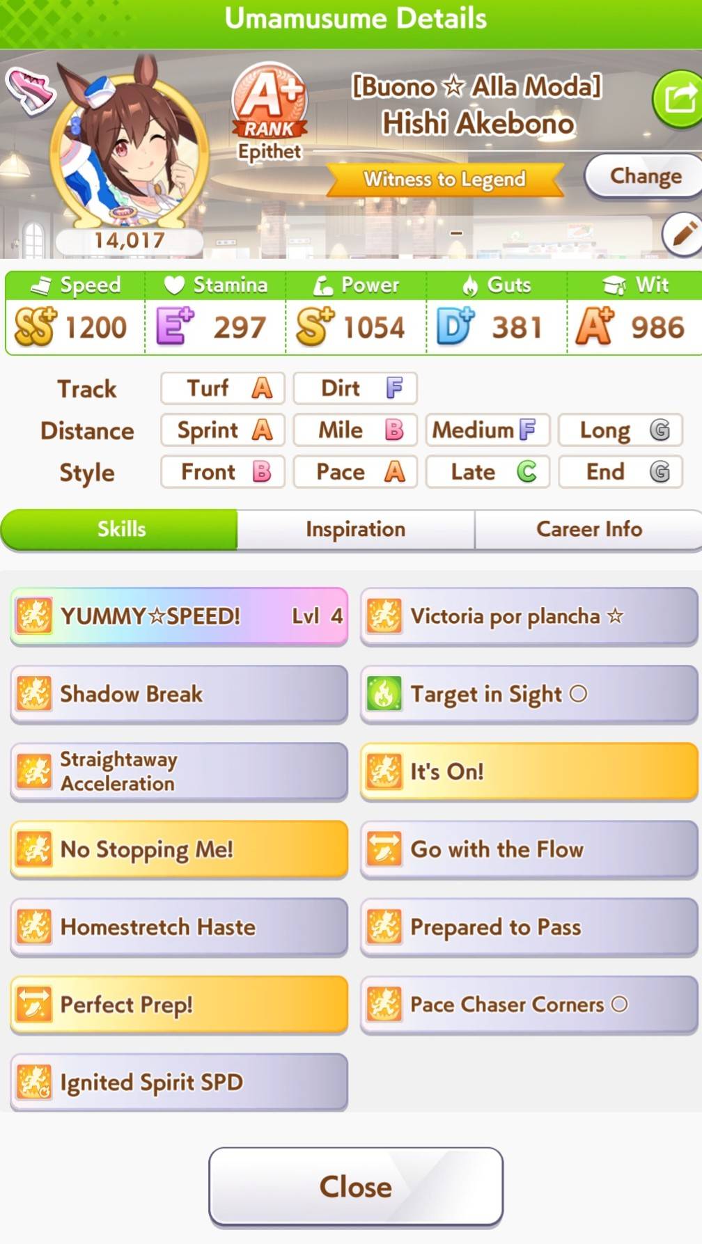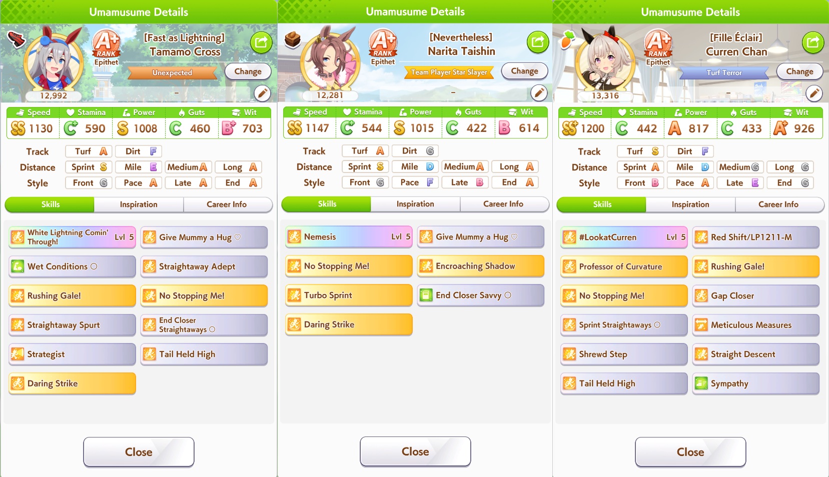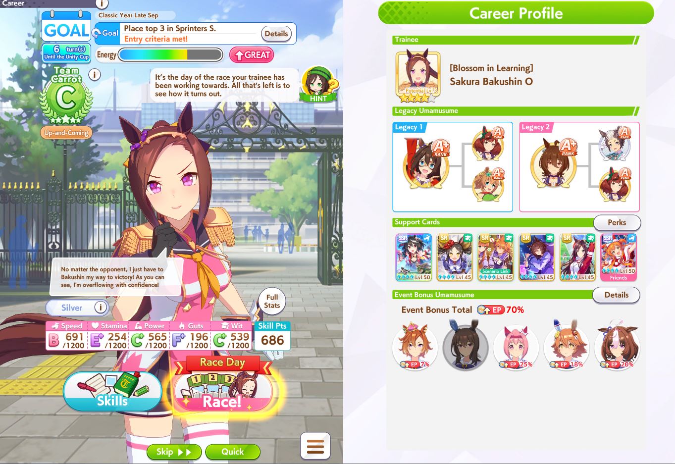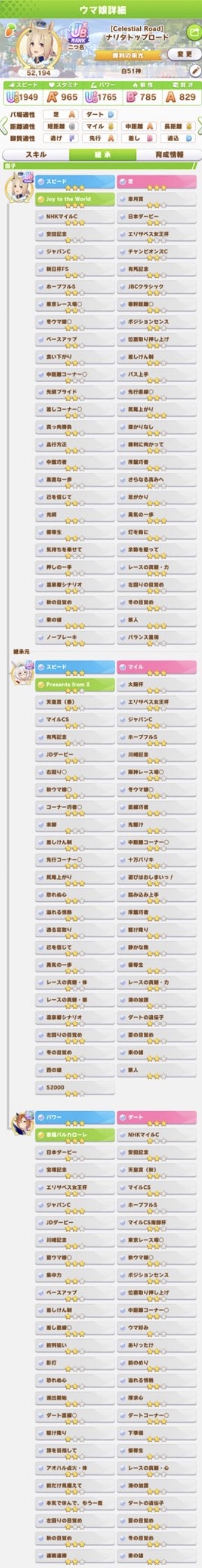 >>556012131>does princess have a stamina recovery unique?Nah, her ult is basically Bakushin ult where instead of being challenged in the second half of the race, it's being challenged on the final straight.>if not stam+guts looks low (I always try to hit 700)On sprint as a late surger? I've seen people say Akebono never gets to trigger ult because you need to be drained of stamina and you naturally get more stamina than you need in a normal career run. I could be wrong, but I'm also out of borrows for the day lmao so that's where I get to test until tomorrow.