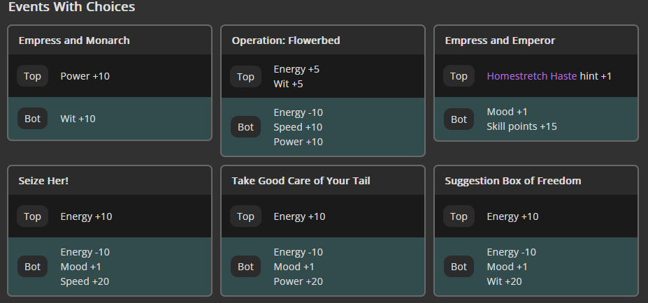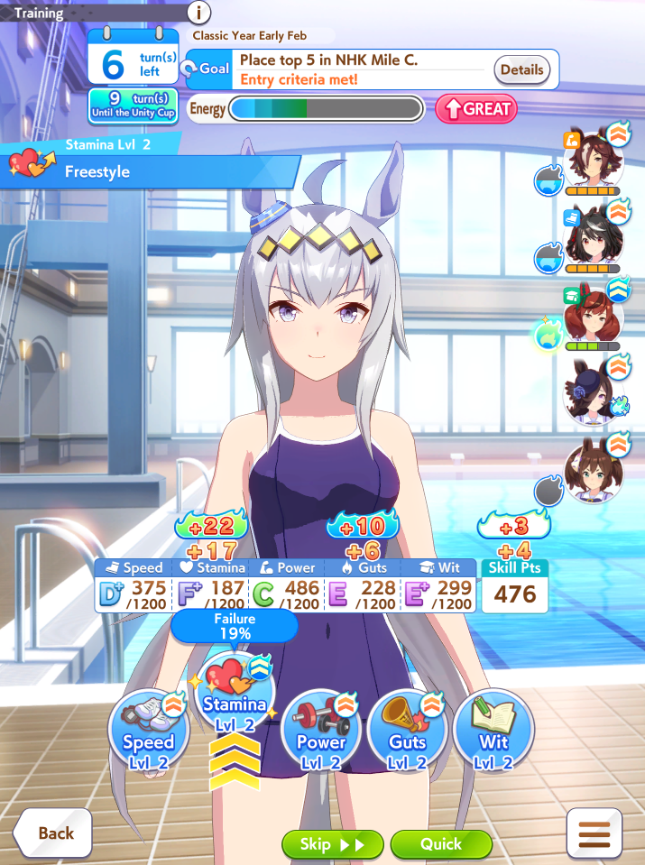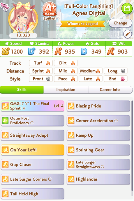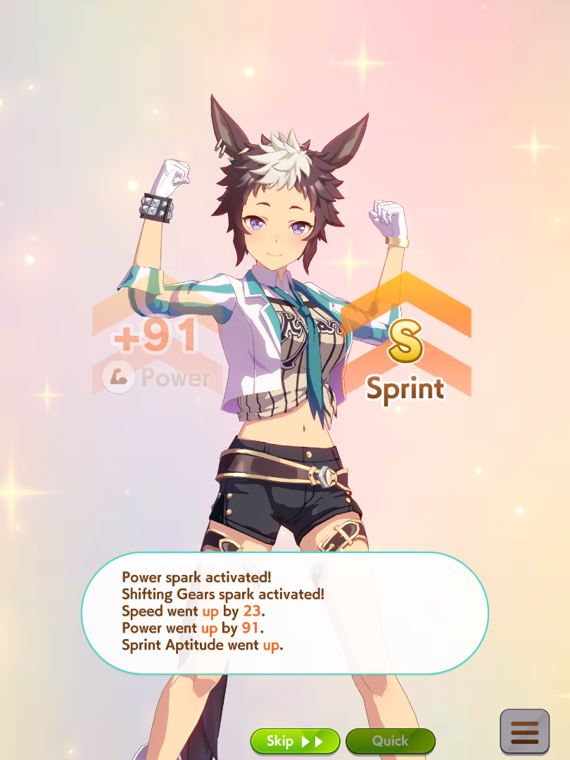 >Got slow metabolism from fatty event which actually impacted my final speed>Also got tissue'dBleh, even if I got max speed, I didn't get great skill hints, only had boring stuff like Late Surger Savvy left when it could have at least been a Corners speed. But I have the core skills that I wanted to try in some scrimmages to see how this Kawakami fares as I refine her more.