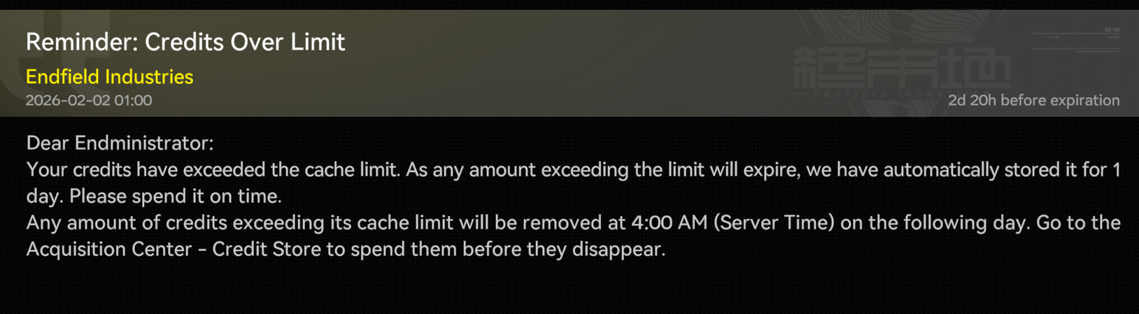Previous thread: >>556005779>Official Websitehttps://endfield.gryphline.com/en-us>Official EN X (NEWS HERE)https://x.com/AKEndfield>Chartered Headhunting ScheduleJanuary 21st to February 7th --- "Scars of the Forge", (Laevatain)February 7th to February 24th --- "The Floaty Messenger", (Gilberta)February 24th to March 13th --- "Hues of Passion", (Yvonne)>Reward CodesENDFIELDGIFTENDFIELD4PC>Twitch Dropshttps://endfield.gryphline.com/special/third-party-binding?channel=twitch>Voyage to the Stars (Ongoing until March 4th)https://endfield.gryphline.com/activity/voyage-to-the-stars/en-us/>Special Launch Streamhttps://www.youtube.com/watch?v=dz2g_D52NR0>Official Release Trailerhttps://www.youtube.com/watch?v=oJ00ggFb8A0>Official Release PV'shttps://www.youtube.com/watch?v=5Xm45NwWOlohttps://www.youtube.com/watch?v=UPpeeft1-8ohttps://www.youtube.com/watch?v=tN80M6IEMo0>Wikishttps://wiki.skport.com/endfield (Official)https://perlica.moehttps://warfarin.wiki/enhttps://endfield.wiki.gg/>Blueprint Guideshttps://talospioneers.com/en>Stickershttps://drive.google.com/drive/folders/13KH3L6QPIKkVH7pBddv4uxwmwJsnOtklhttps://drive.google.com/drive/folders/1OuVtjv1k-9c3M6n7d4PX3CGG5bkwH04ahttps://drive.google.com/drive/folders/1AStB8bzFk3lSwMwczWPkFYCBrZe0vHOghttps://drive.google.com/drive/folders/1yS0lqUhxf8tBRtpDFfCU1y16IS2sSeF7>Fr/end/sSubmit your info, /end/min:https://forms.gle/Fo7BhZMKaKqiWyL19View other /end/mins:https://docs.google.com/spreadsheets/d/1YtxiDss0hgEQhLlZgpfzyGrJrzUcqDzOS9T6IH-BiVc/edit?usp=sharing