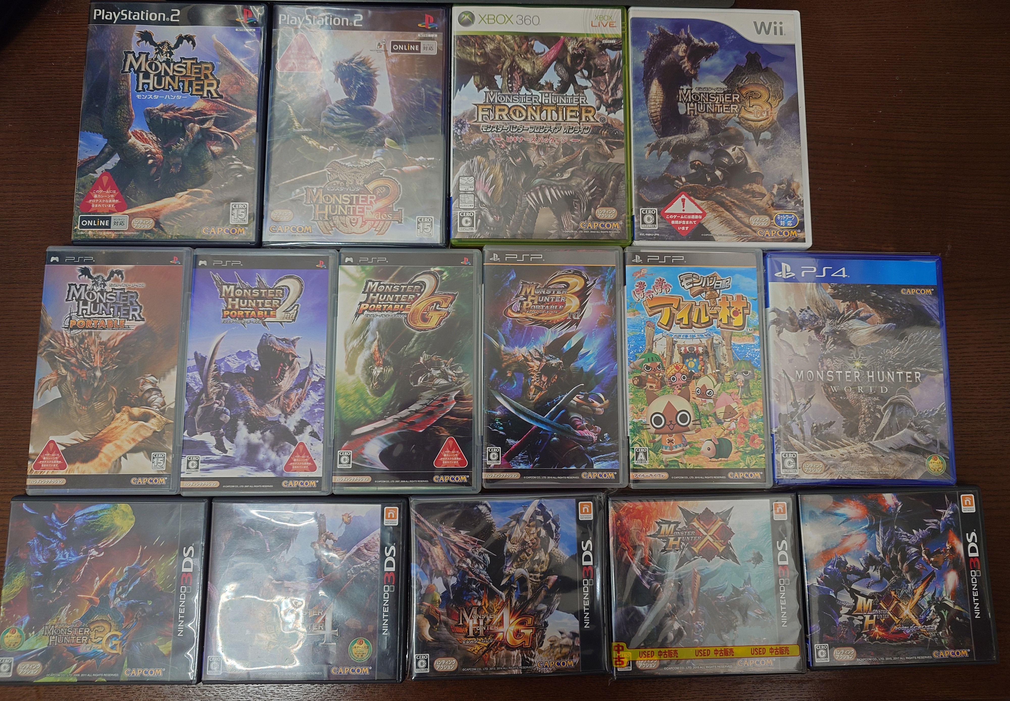 Never cared much owning games just to display them, but I decided to go ahead and bought all of this (across 3 different shops). Just missing MHG (PS2), Tri G (Wii), Diary G (PSP + 3DS) and the 100 versions of Frontier on PC.All for less than 3k yen (20 dollars). The most expensive one was XX at 500 yen. Majority were 110 or 220, with Dos, 4G and World at 297 yen. Was not planning to buy World, but at that price, I thought why not.I will look for the rest whenever I happen to stop buy the manga/game stores.