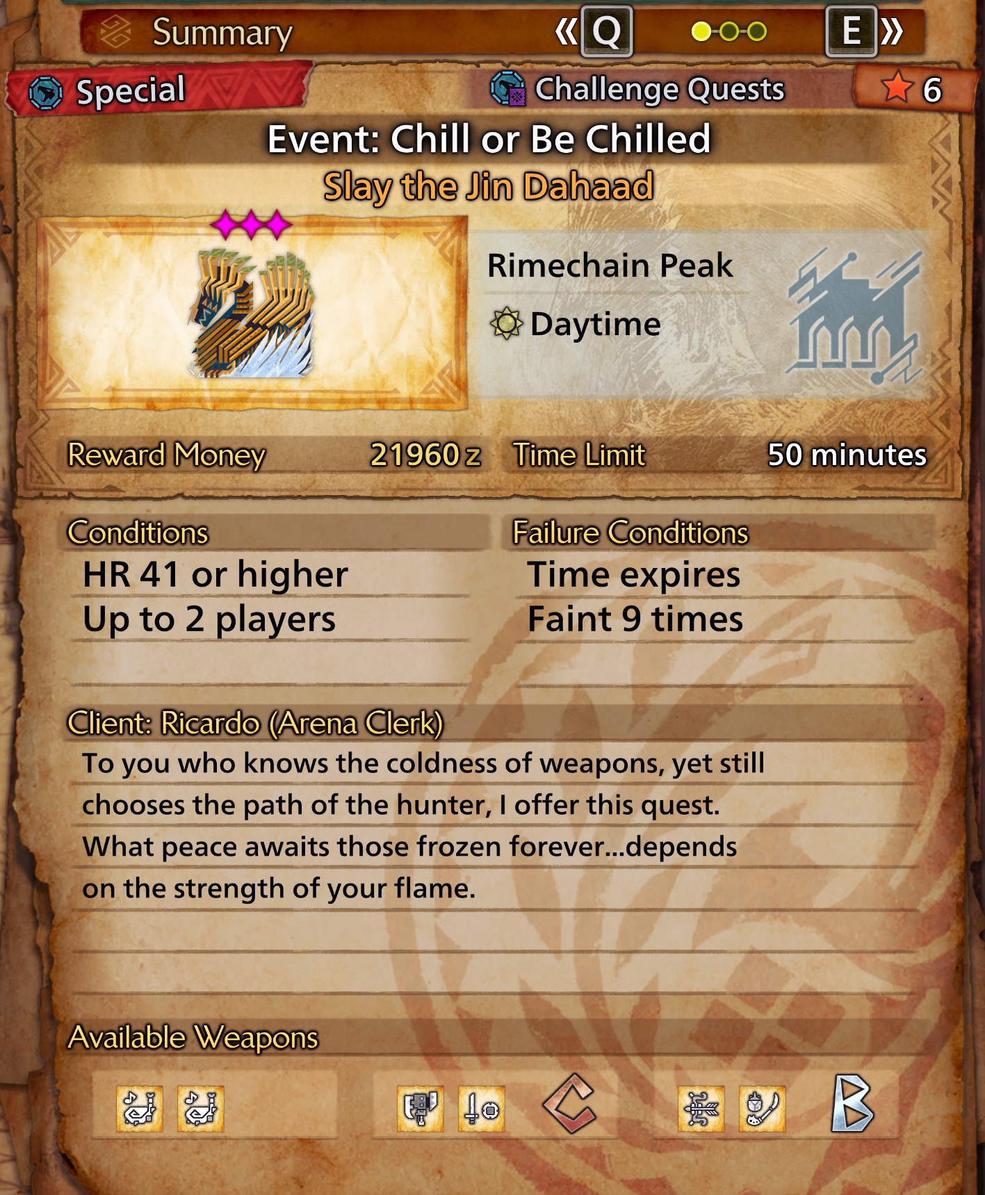 >>556040969>"Stalking Supper":This quest providesKunafa Cheese, a permanent additional ingredient for yourBBQ Grill. >"Tongue-Tied":A high-rank hunt for a Tempered Chatacabra that rewardsHard Armor SpheresandAdvanced Armor Spheresfor efficient gear leveling.