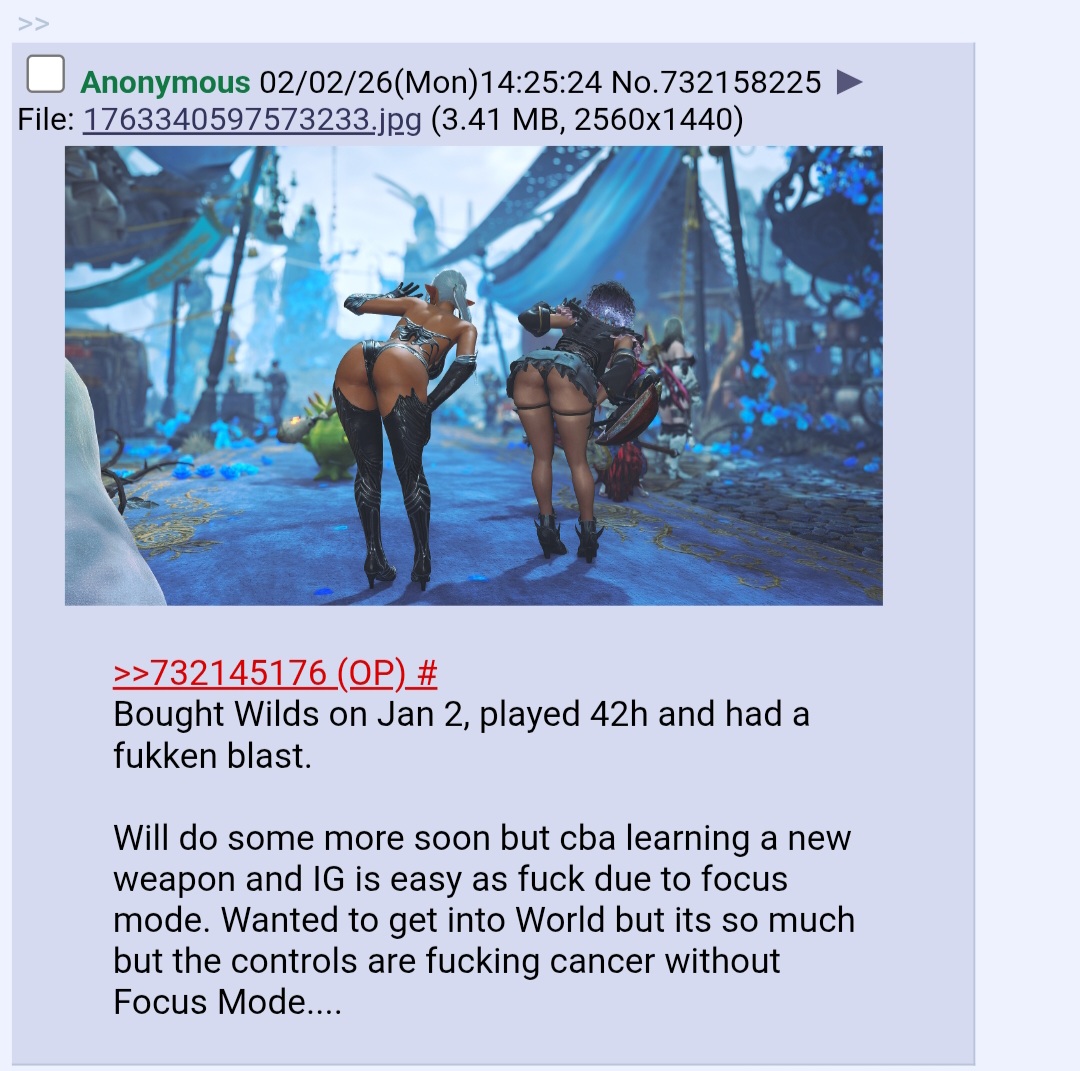 >I have a question about Monster Hunter!https://pastebin.com/D3zuHuqK >MH Stories 3: Twisted ReflectionRELEASE DATE: MARCH 13, 2026Official Website: https://www.monsterhunter.com/stories3/en-us/Steam Store: https://store.steampowered.com/app/2852190/Monster_Hunter_Stories_3_Twisted_Reflection/Announcement Trailer: https://www.youtube.com/watch?v=XszCdDNI-lsIntroduction Video: https://www.youtube.com/watch?v=ps6yAI5THmMHabitat Restoration Trailer: https://www.youtube.com/watch?v=764b4_5dZJgGameplay Video: https://www.youtube.com/watch?v=6JDesEGUuO4 >MH WildsAT ARKVELD: FEBRUARY 18, 2026Wilds Info: https://www.monsterhunter.com/wilds/en-us/Steam Page: https://store.steampowered.com/app/2246340/Monster_Hunter_Wilds/Event Quest Schedule: https://info.monsterhunter.com/wilds/event-quest/en-us/scheduleTU4 Trailer: https://www.youtube.com/watch?v=Aijx69md9pUTU4 Changes: https://info.monsterhunter.com/wilds/update/en-us/Ver.1.040.00.00.html/mhg/ Persistent Lobby Info: https://i.imgur.com/M7MmPid.jpeg >MH WorldWorld on Steam Store: https://store.steampowered.com/app/582010/Monster_Hunter_World/Iceborne on Steam Store: https://store.steampowered.com/app/1118010/Monster_Hunter_World_Iceborne/General Info: https://pastebin.com/PKeD8Smg >MH RiseRise on Steam Store: https://store.steampowered.com/app/1446780/MONSTER_HUNTER_RISE/ Sunbreak on Steam Store: https://store.steampowered.com/app/1880360/Monster_Hunter_Rise_Sunbreak/General Info: https://pastebin.com/rewGysVq >Older Game Emulation and Multiplayer/Frontierhttps://pastebin.com/fYyeU0kY >Databaseshttps://kiranico.com/ >Where does /vg/ play?/mhg/ has its own squad in Wilds: RL9XQ7VMPost the game, platform, room code, and password (7243/rage) >/mhg/ OP Template (use this when making new threads)https://pastebin.com/K3FHwGpr Previous thread: >>555866170