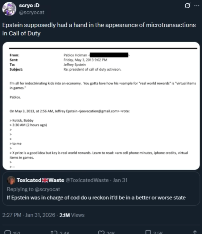 >>556122106according to latest leaks, epstein got banned from xlive for threaths, doxxing etc, back in 2013 and then contacted activision ceo about including mass microtransactions in cod gamesindirectly responsible for how blood sucking modern aaa games are, that's plenty of wrong