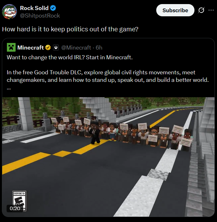 https://xcancel.com/Minecraft/status/2018380915244663086#>Want to change the world IRL? Start in Minecraft>In the free Good Trouble DLC, explore global civil rights movements, meet changemakers, and learn how to stand up, speak out, and build a better world.Mojang…