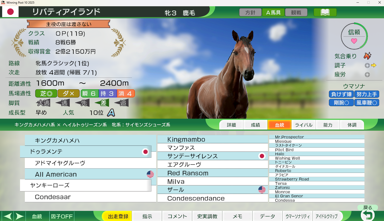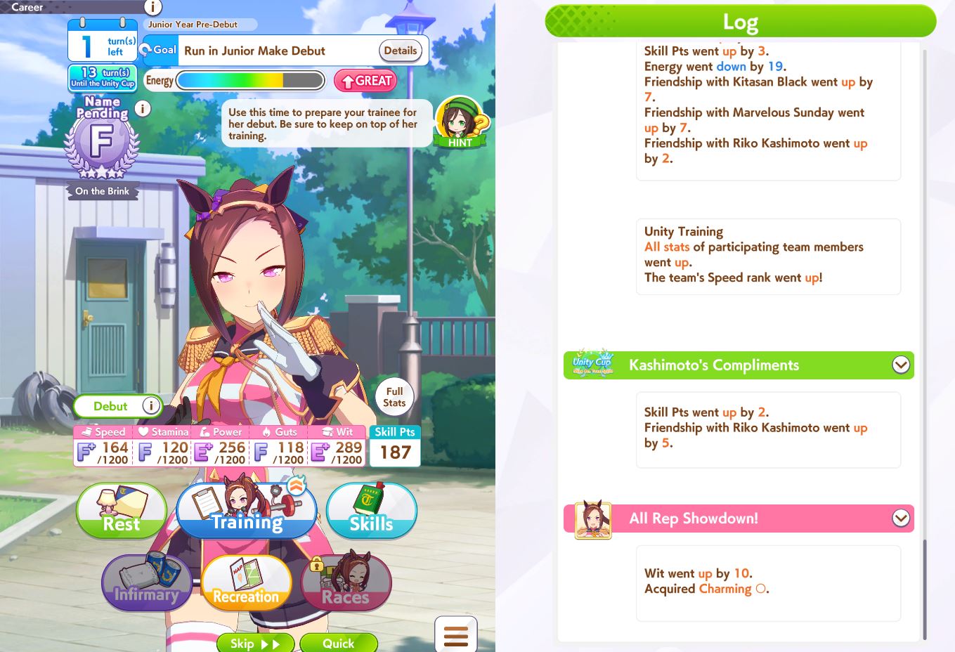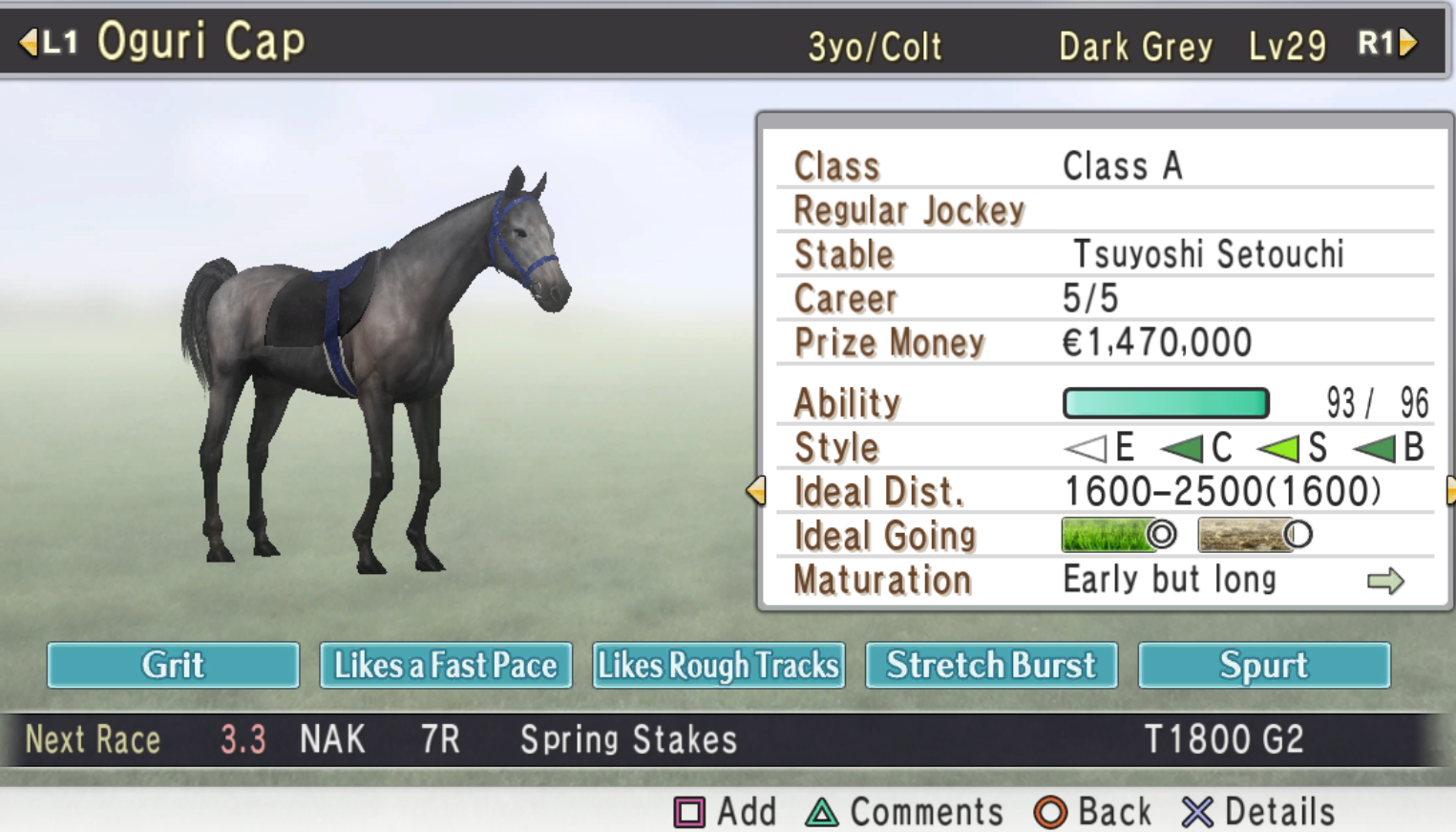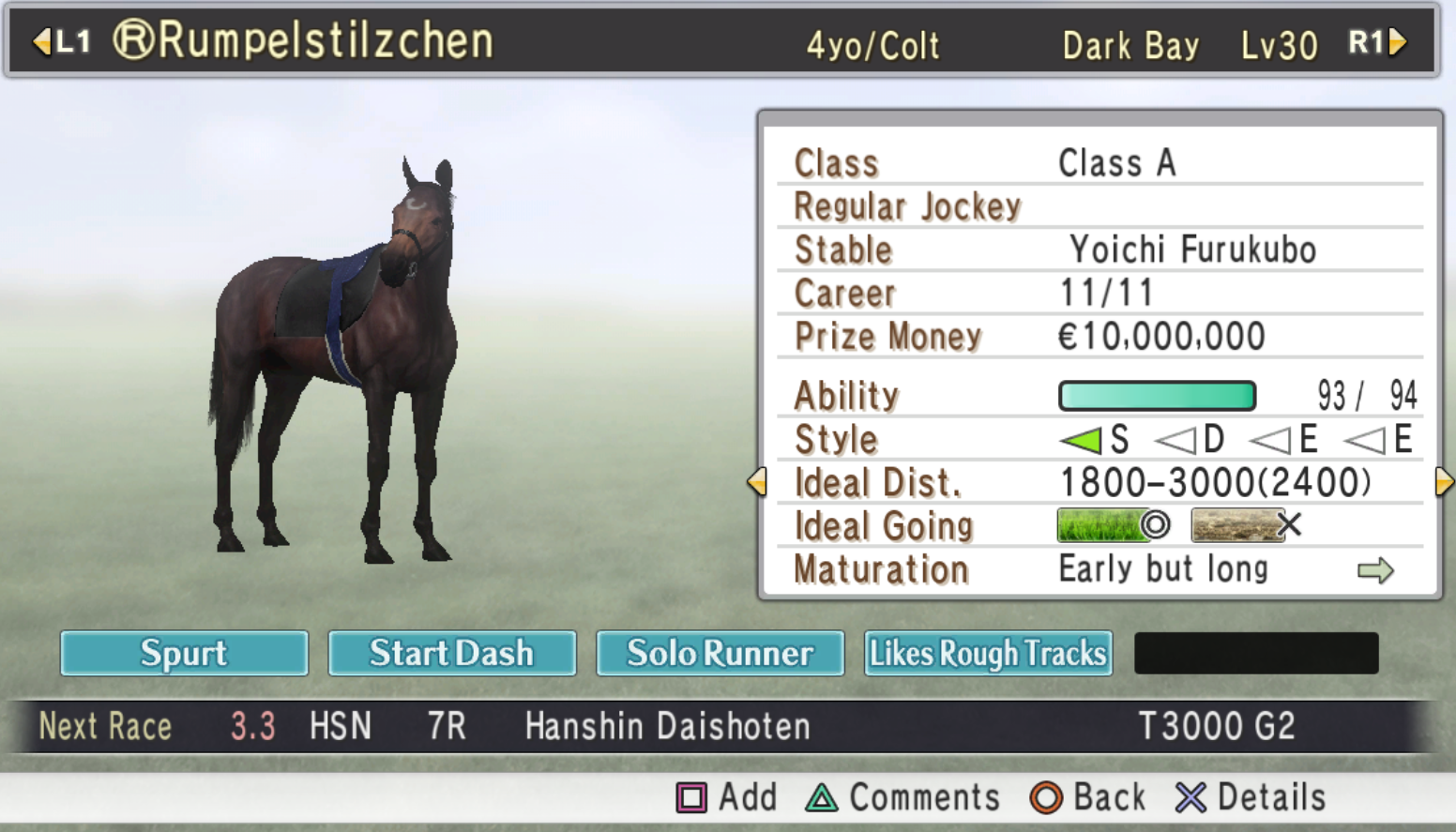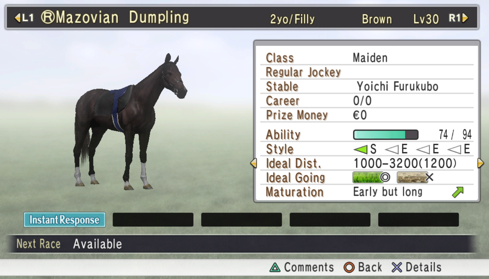 A new filly joins the stable, the debut is planned for September (current month is January)Seems like a perfect girl for Rumpel