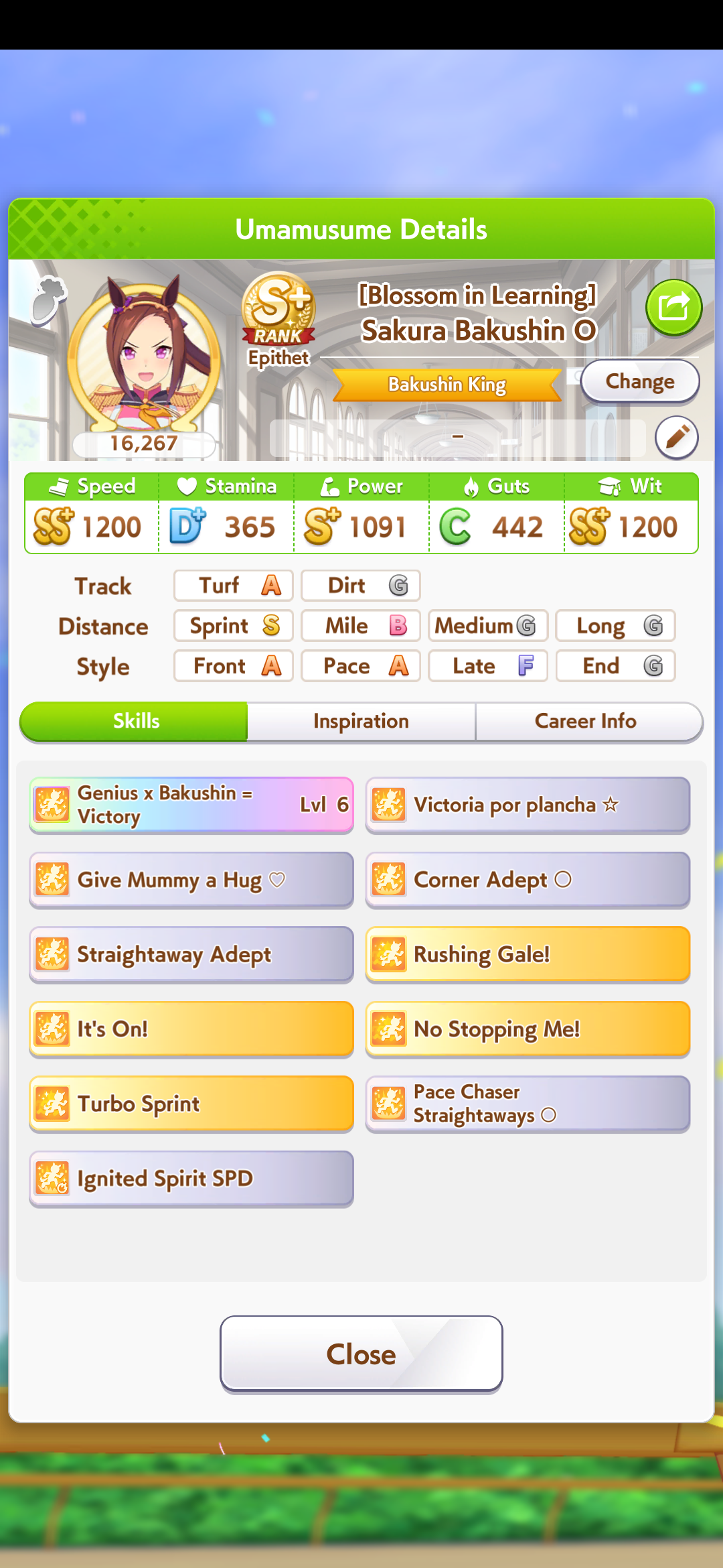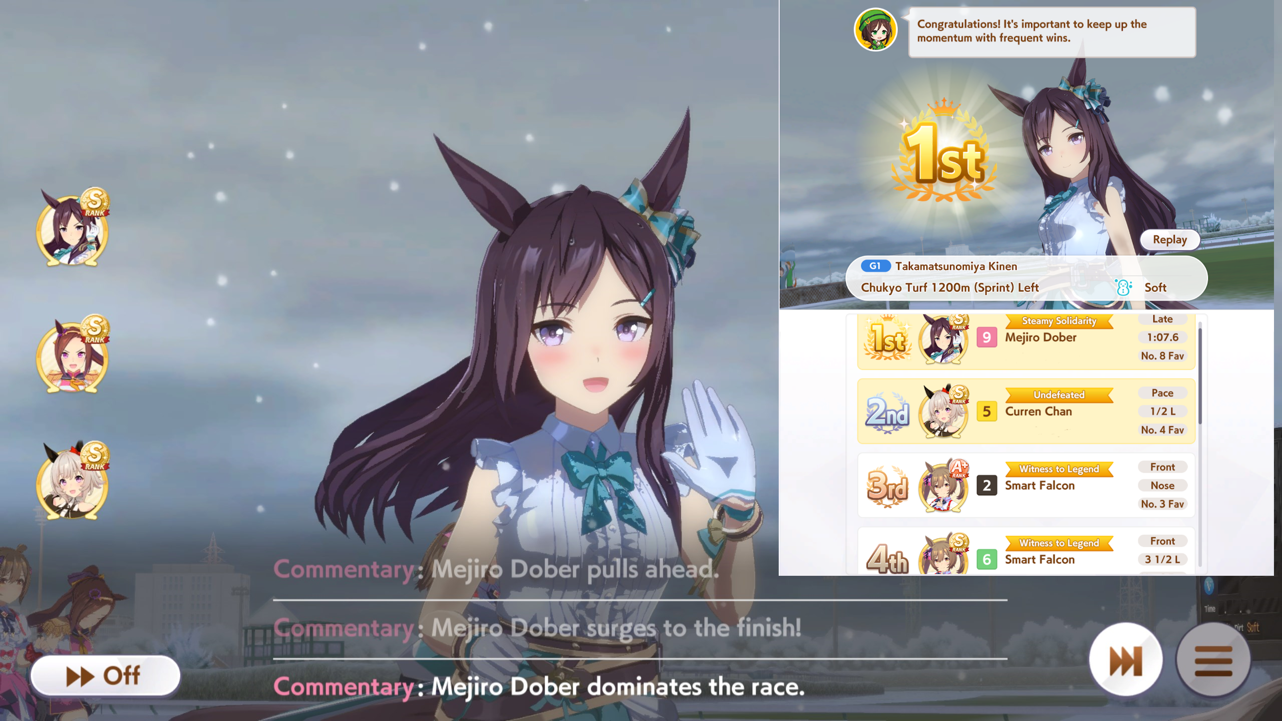 I have to say I'm really glad I got Hishi Akebono during my pursuit of Tamamo Cross. She's such a sweetheart! I also like how relatively drama-free her career is, the only sad part really was when there was concern she would have to lose weight. But then she decided she was buono as she was, so never mind.
