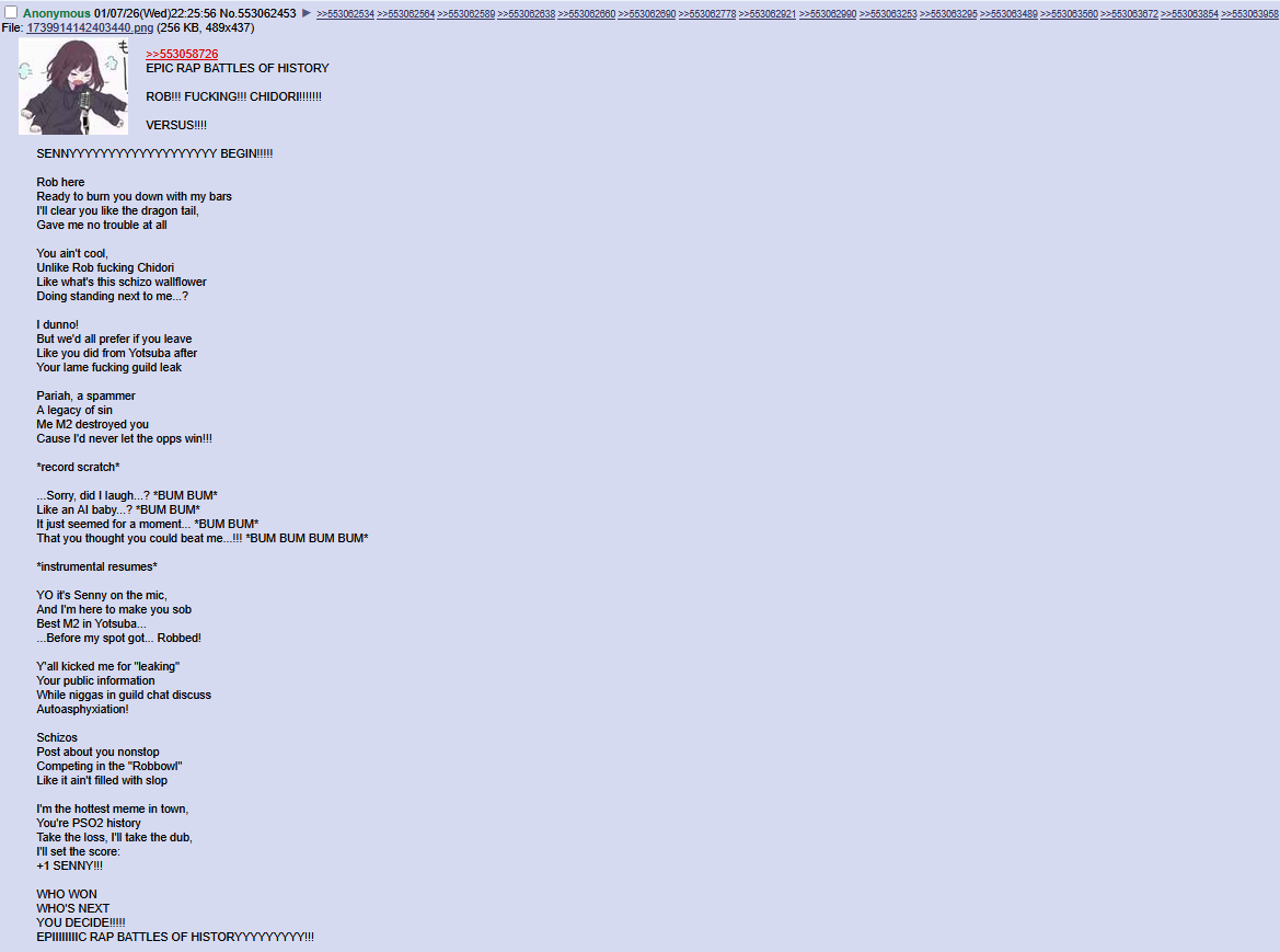 >>556100707The senny posting and the clique shitposting were the same group. They felt some kind of power spinning on the thread with purely only their bullshit. There's a reason it's gone now, do the math.