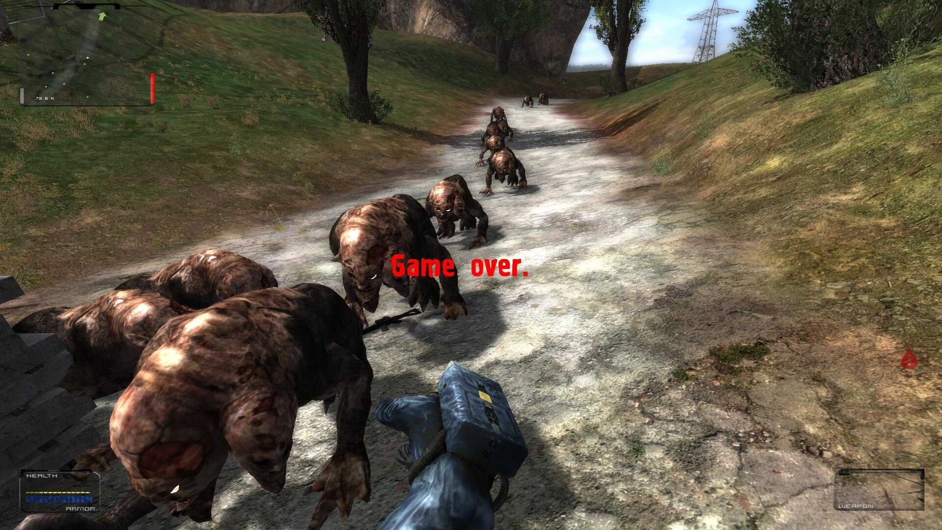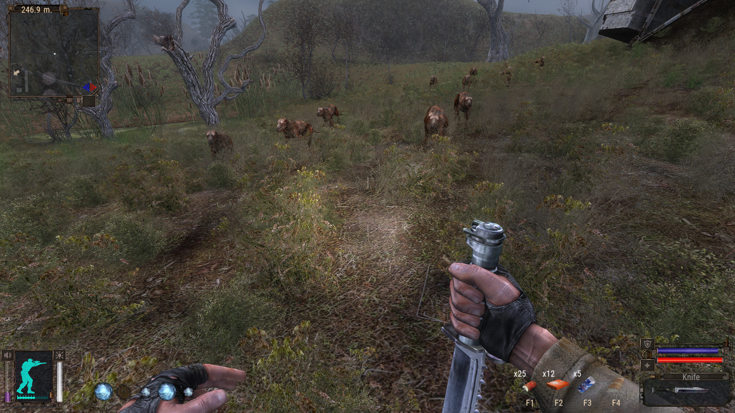 >>557607851>>557653894It's SoC EE with no mods.I don't remember ever seeing this many pseudodogs at once, they'd be like 2-3 mixed with regular blind dogs usually.I also had groups of 5-6 snorks, 8-10 blind dogs come from level changers on different maps.>>557655253The dogs will not follow you into their range anyway, they won't go past that truck.