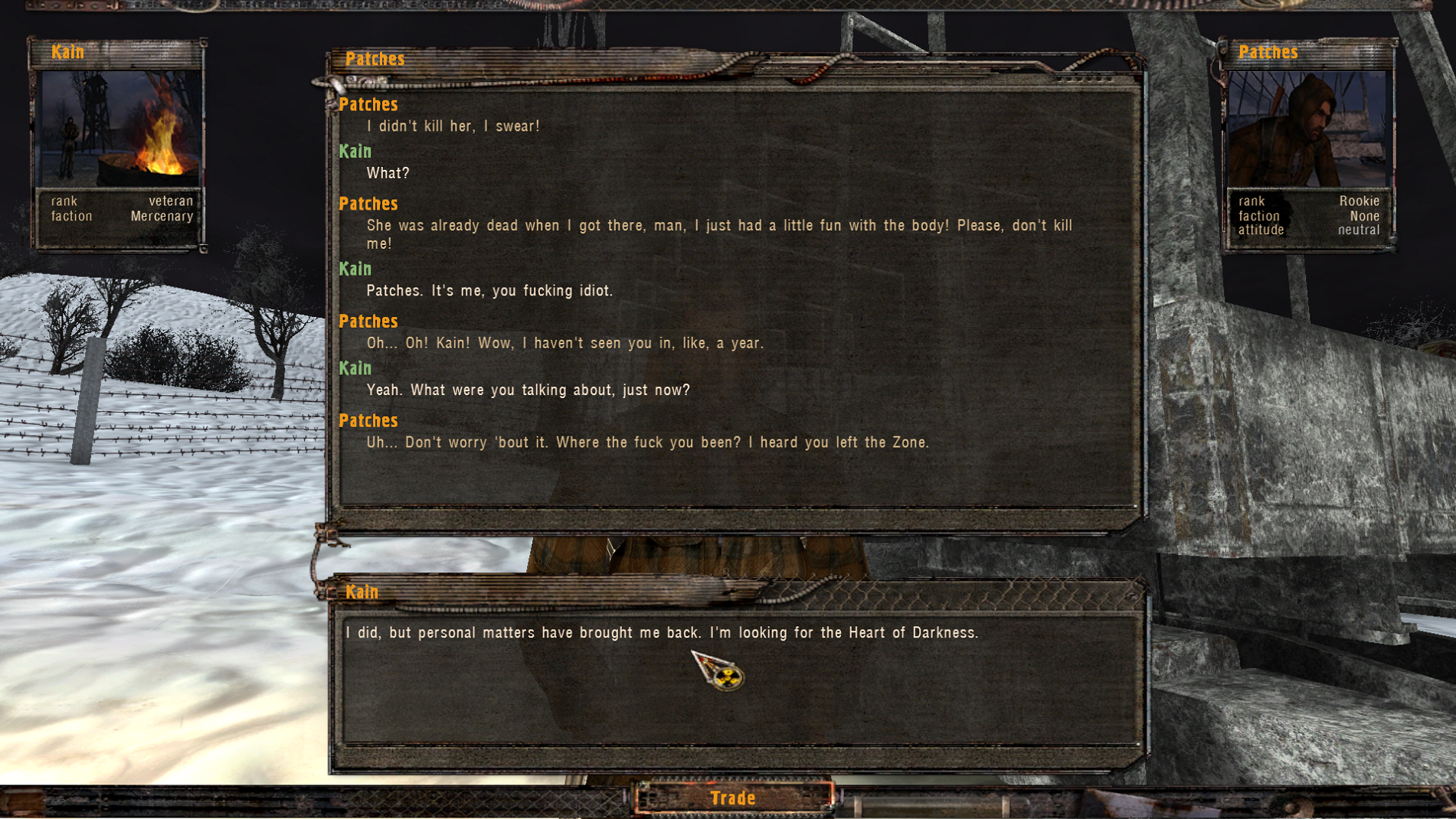 I have entered the Clear Sky limbo in GarbageContinually being mugged by perpetually coming (still neutral) bandits and killing them afterwards before I can even loot the bodies and get the fuck out