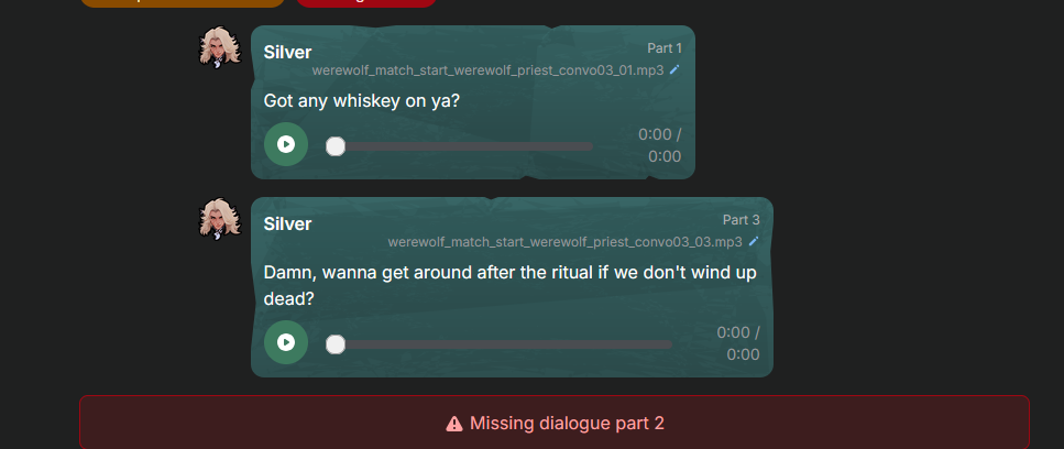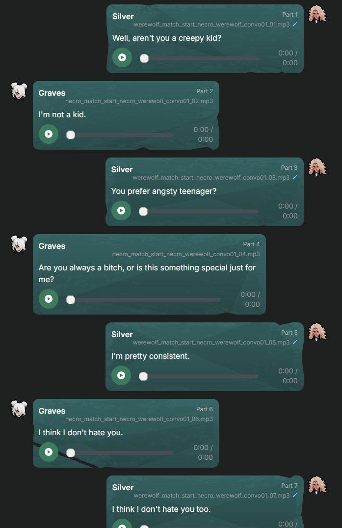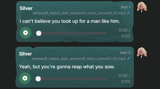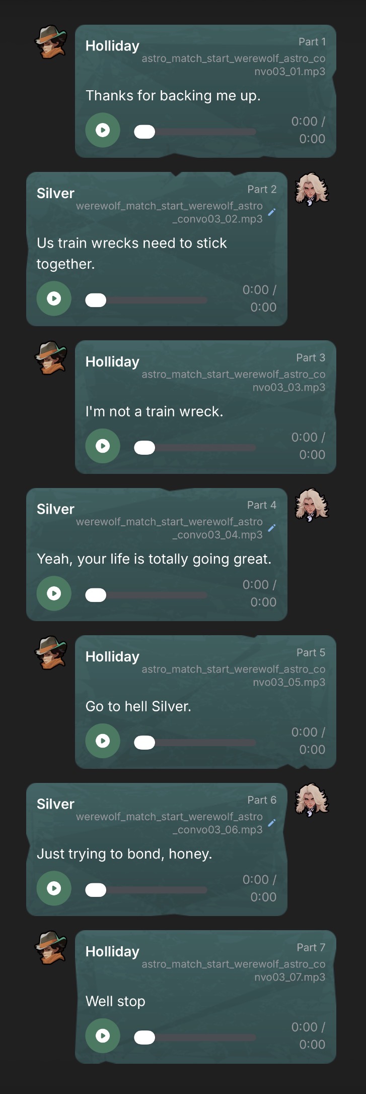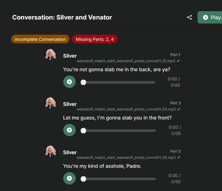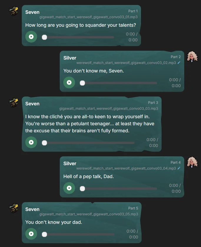 I don't know how to put it but I remember people complaining about the Overwwtch character interactions and saying they felt robotic or boring and I feel like this game has the same problem. I think partially the issue is an awkward pause between lines trading but also that the writing is just kind of weak. The lines where they aren't conversing are good and the rival lines too but when they take turns interacting it comes apart