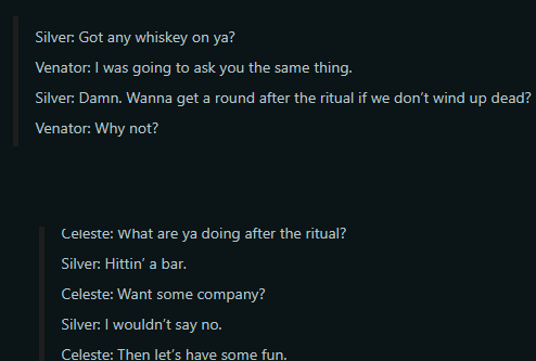 >"OMG SILVER FLIRTS WITH CELESTE/VENATOR BI QUEEN">look at lines in question>Alcoholic doesn't want to drink alone