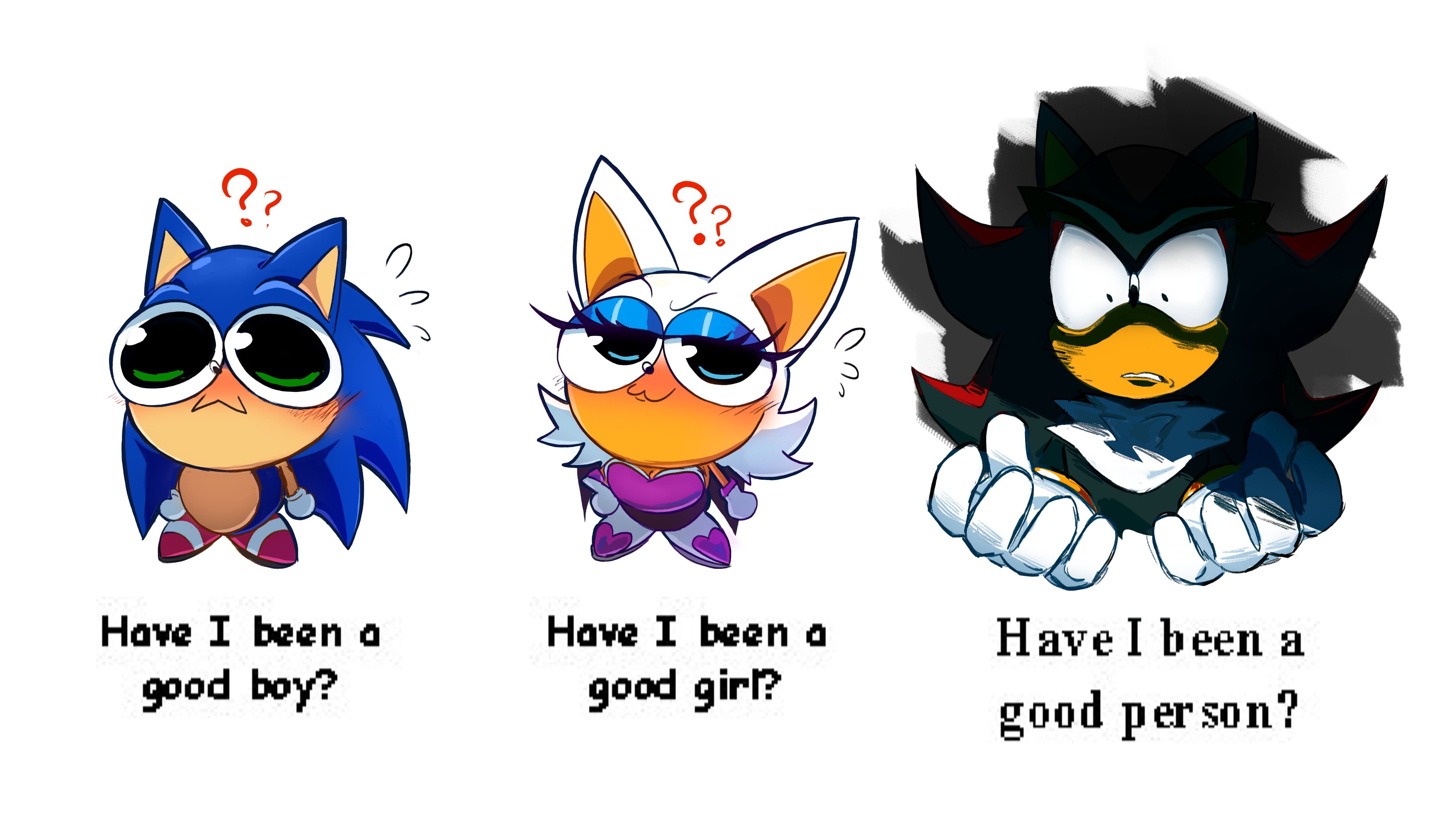 Rouge: I don't want kidsShadow: I don't like anyoneSonic: I don't want to get married Amy: I will love Sonic until I die of old ageSurge: Just thinking about Sonic makes me angryTheir fans: no no they didn't mean it literally