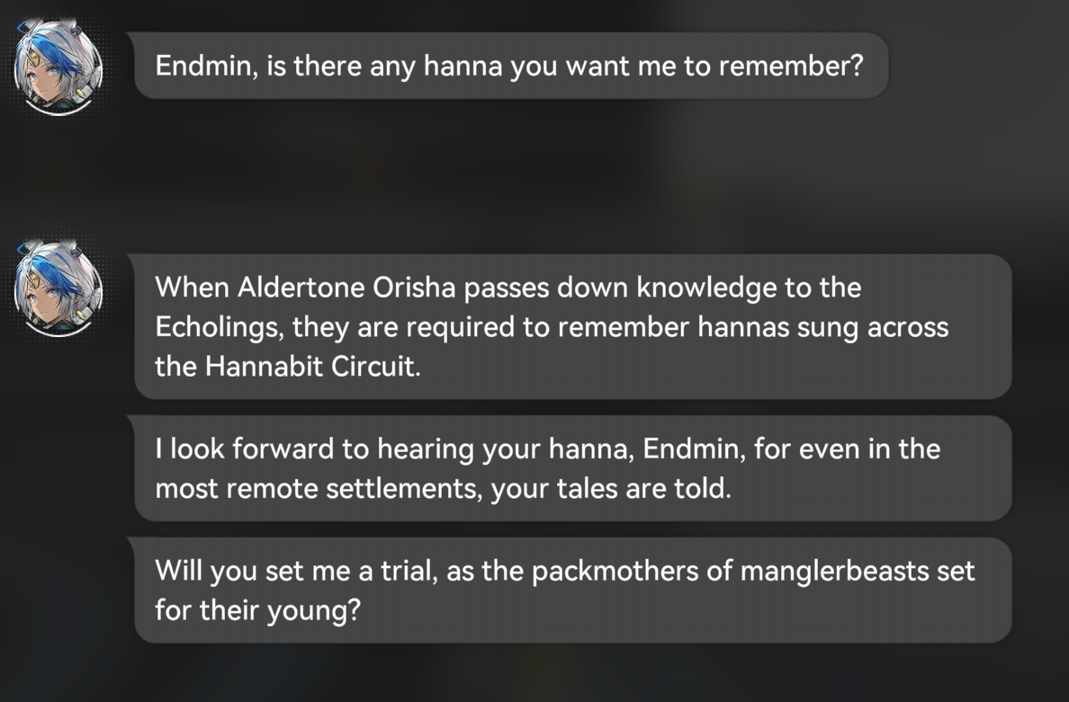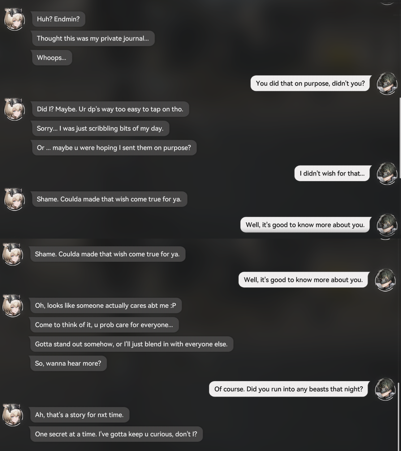 >Laevatain quest>Endmin has a lot of voiced lines>Wulfgard quest>Endmin has a lot of voiced lines>Yvonne quest>Endmin is almost completely mute