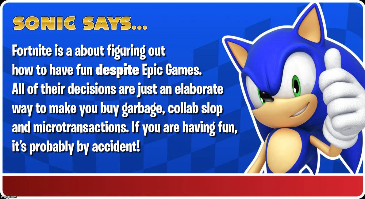 >>556123721>could've had a minecraft-like game with cool lego machine building and fully destructible environment>get some lazy grindy bullshit instead>could've gotten a fortntie kart with bluglo as mushrooms and slurp as stars racing through tilted towers and pleasant park>get some lazy knockoffo trackmania shit instead>disregarding trackmania is largely a singleplayer game to quickly reset for best times>nah only online and no quick restart fuck you>also the maps suck and have nothing to do with fortnite>I don't have any complaints about Festival, I don't play it and I just play Clone Hero for custom shit anyway>could've had a fun NBA jam or 2k style basketball mode>nope a fall guys minigame to force fall guys bullshit so no skins and boring gameplay>could've had a fun season>nope let's pander to streamers >could've had cool sidekicks>overpriced, not enough customization, not enough animations, all reuse the same animation rig so cuddle team JR animations until the end of time>Blitz could've stayed fun>nope let's kill weekly updates and gut the chaotic stuff so now it's just fast BR with a less interesting map>only 2 maps btw even though all the maps are sharted out with UEFN prefabs>could've had a fun TDM>go a CS:GO clone that flopped with 1 map to last 4 months then got killed off after they released maps with no fucking textures>could've had a cool story with the characters>sidelined by [collab] hijacking everything for 90% of the year>could've had a cool creative space with cool maps and custom skins and interesting experiences>limited engine + no cosmetics + no custom weapons so everything is RVB box fight tycoon sloppa>could've had good [xyz] collab>Butchered. No themed items in the lootpool. Only skins. And the skins suck. WELCOME TO THE POTENTIAL GAME!!! IT COULD BE SO GOOD!! JUST 1 MORE COLLAB GUYS THIS'LL FIX EVERYTHING!!! 1 MORE SEASON AND THIS GAME WILL BE PERFECT!!!