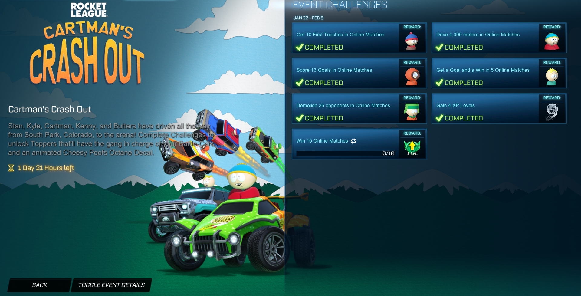 South park x RL event ends next thursday on shop reset, only the Cheesey Poofs decal is compatible in fortnite, said decal is only available for the Octane