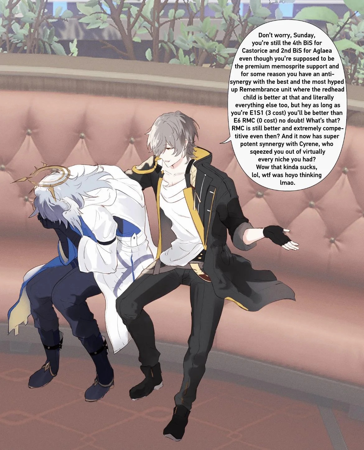 I fucking hate Sundayfags. They had no problem with him powercreeping Sparkle into useless status, but now are crying that after a year Cyrene now is a viable side grade in Aglaea teams. If they were so concerned about powercreep, they should never have accepted Sunday's stupid kit with 100% AA+sp+energy restore. But they had no problem with Sunday becoming the BiS for every hypercarry when he released plus ruining Aglaea, so now they can get fucked when it's his turn to fade